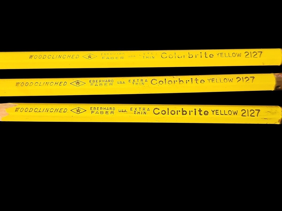 Set of 3 vintage Eberhard Faber Colorbrite Yellow 2127 Goldband color pencils, USA-made.