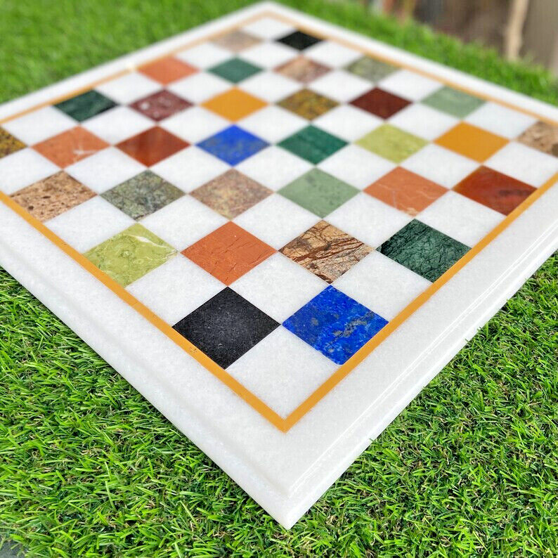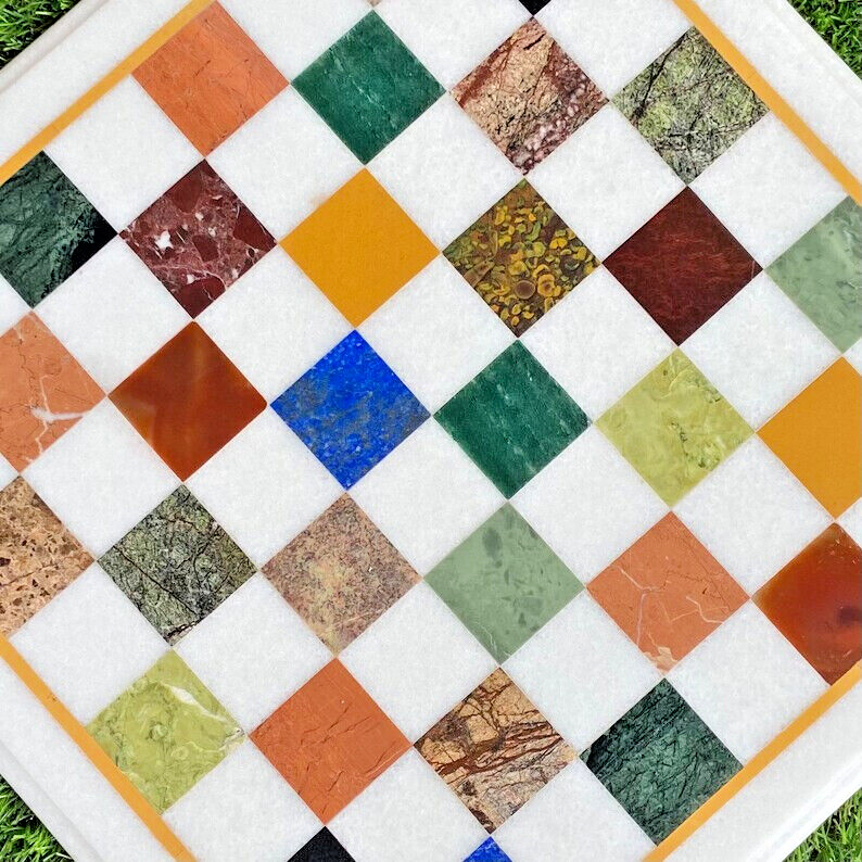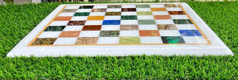 18" White Marble Chess Table Top Handmade Chess Board Semi Precious Inlay Stone