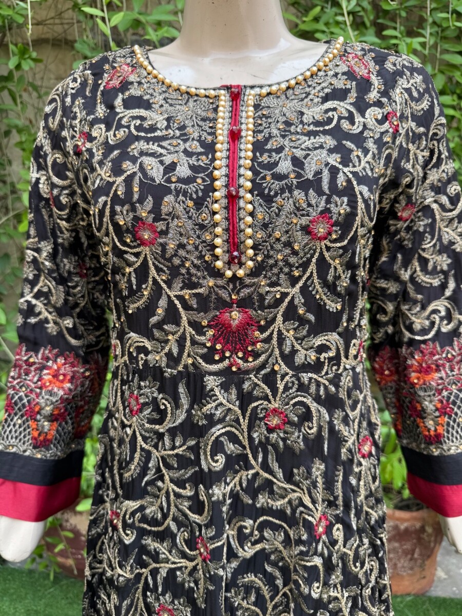 ? Black Chiffon long Maxi style shirt with full thread embroidery Sequins work, back is full embroidered.