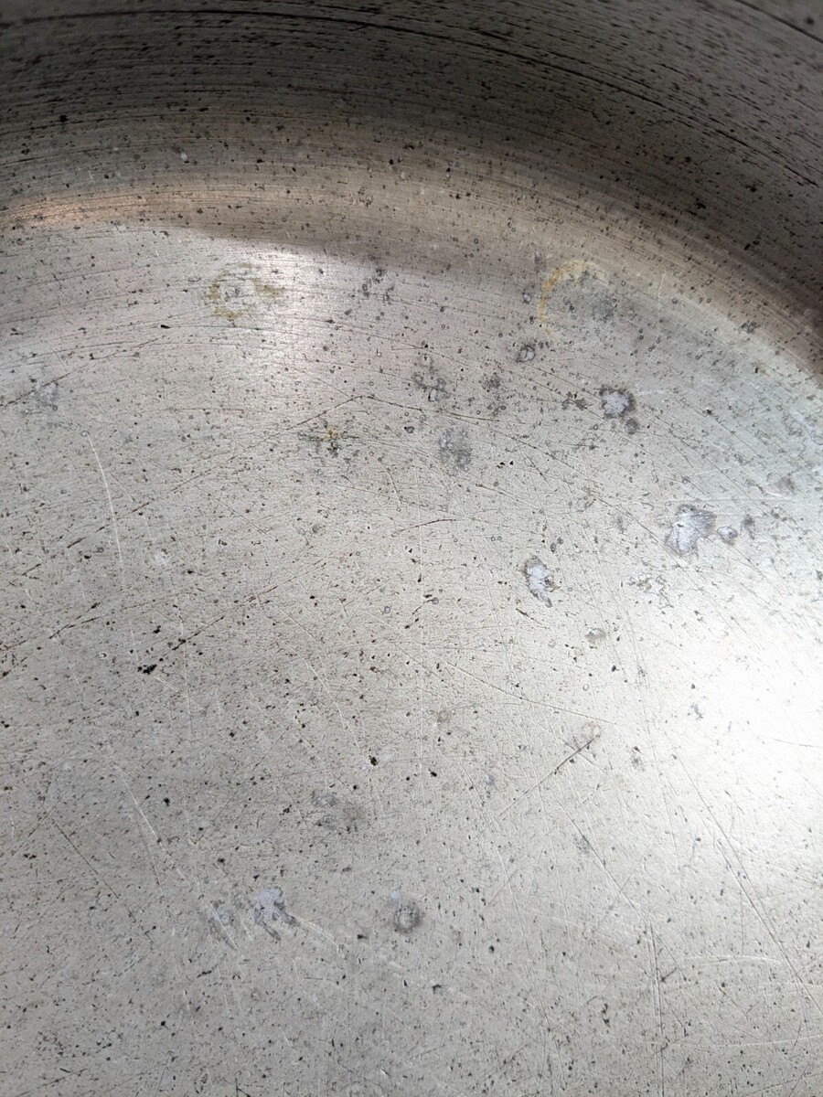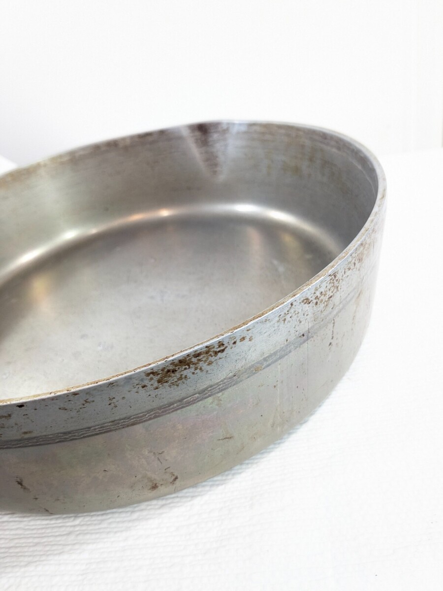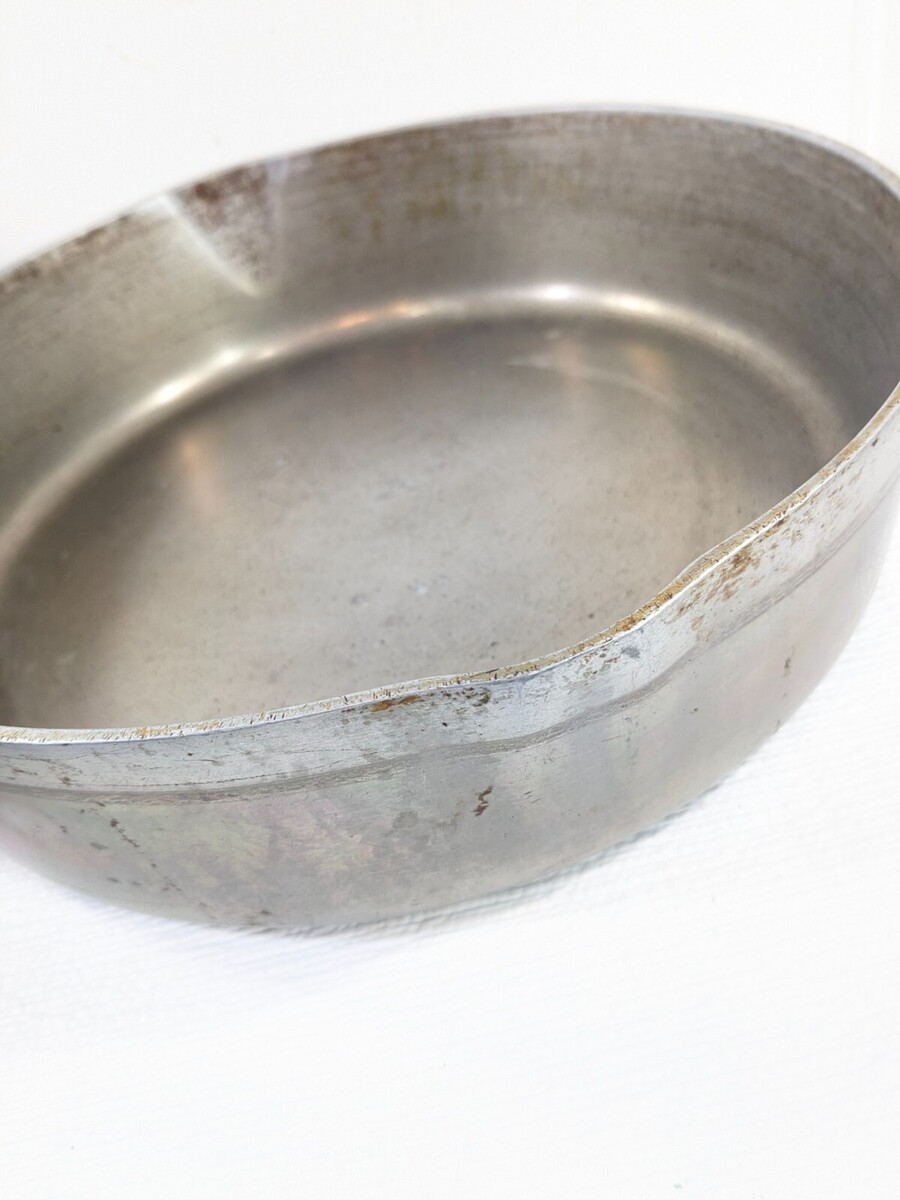No lid. Some wear/patina/marks/discoloring from use as shown. Could use a bit more cleaning if desired. See pics for details.