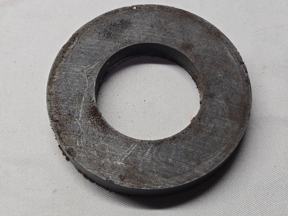4" ferrite magnet removed from a speaker in good condition. Magnet is strong, most likely a Y30H or C8 grade, which is very common for speaker magnets, and is axially magnetized through the full thickness. Ideal for both entertainment and practical purposes, will never rust and is a fraction of the cost of neodymium magnets of similar size.