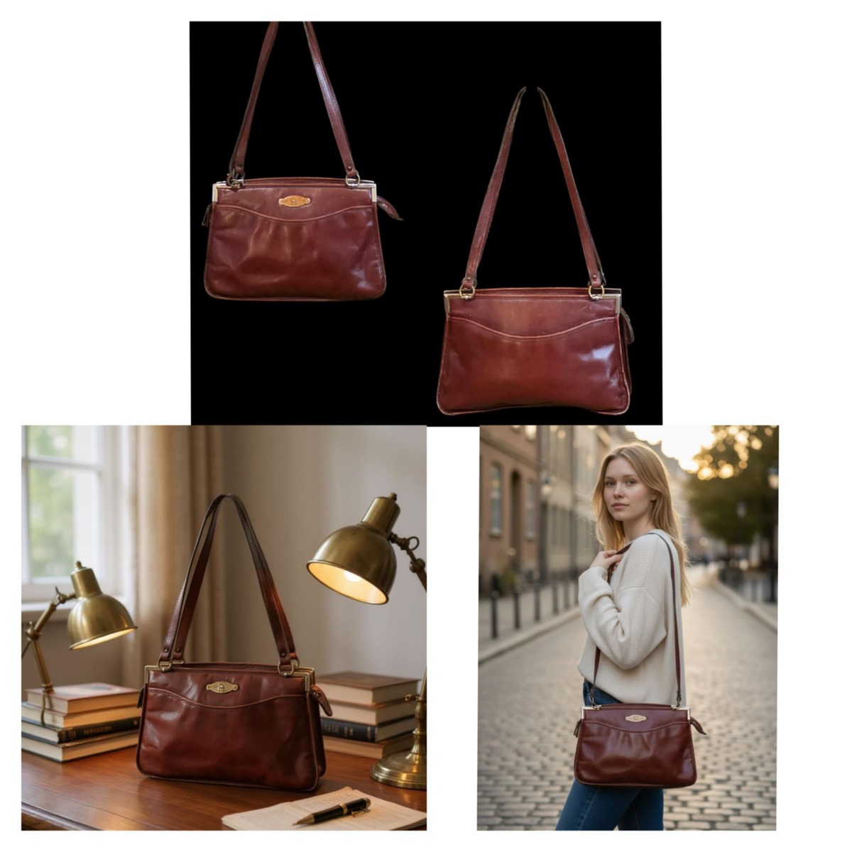 "Eitenne Aigner"...... handbags are known for their high-quality leather and classic designs. vintage style from the brand, featuring a rich brown or oxblood color and a distinctive metal buckle closure. "A" logo, shaped like a horseshoe, was introduced in the 1950s and is a signature of the brand.