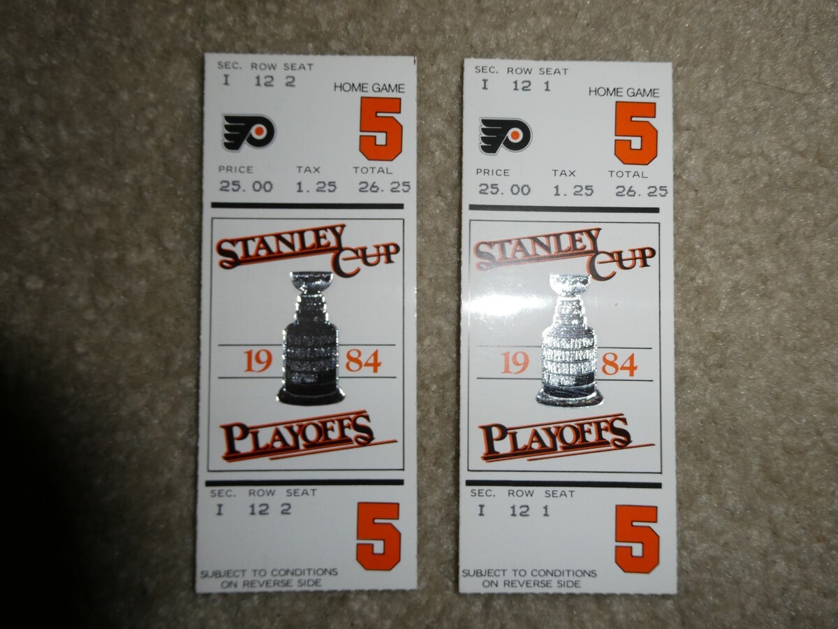 are bidding on a nice, original lot of 2 of the 1984 Stanley Cup Playoffs Game 5 ticket stubs for the Philadelphia Flyers, in the pictures. Very nice shape, little wear as shown. Zoom in for condition.