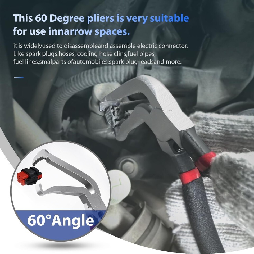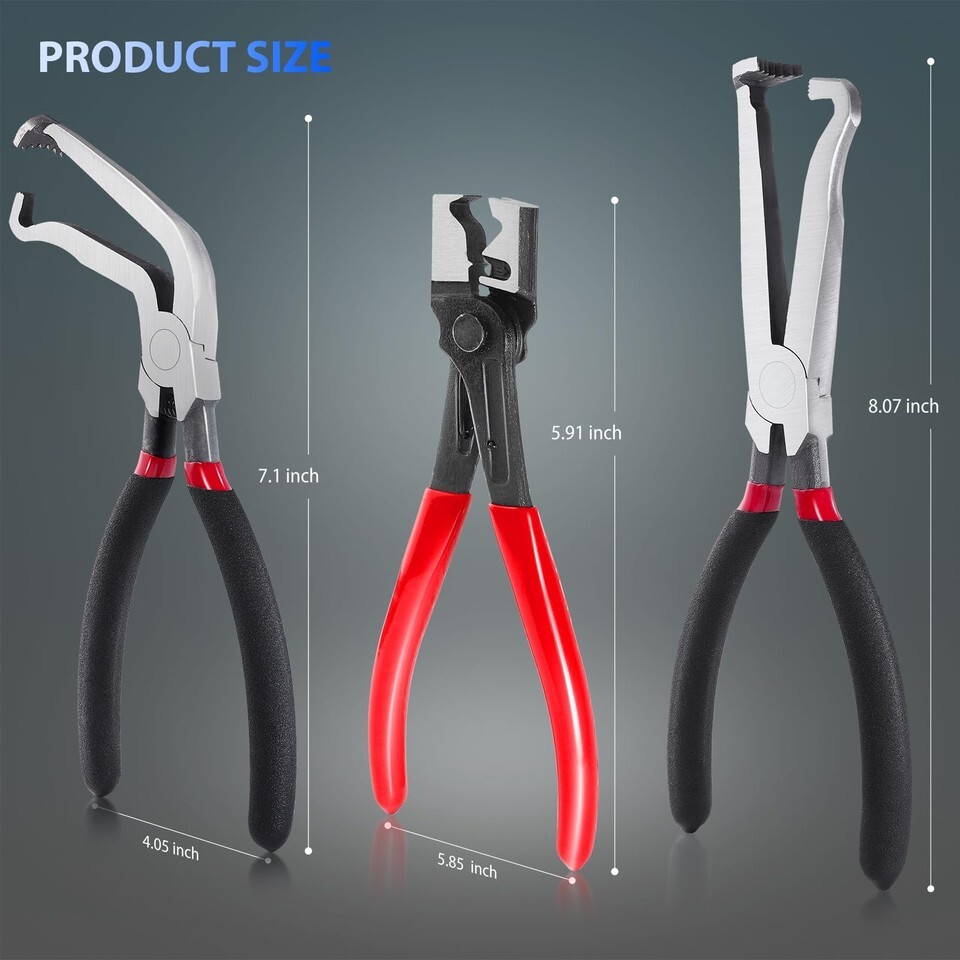 ?Widely used? 3-piece electrical disconnect pliers set (2 straight * 1 curved 60) with ergonomic non-slip handles to meet your maintenance needs, suitable for narrow or recessed workspaces, can handle repair areas that are out of reach of straight pliers, easy to unplug the harness connector without damaging the wires