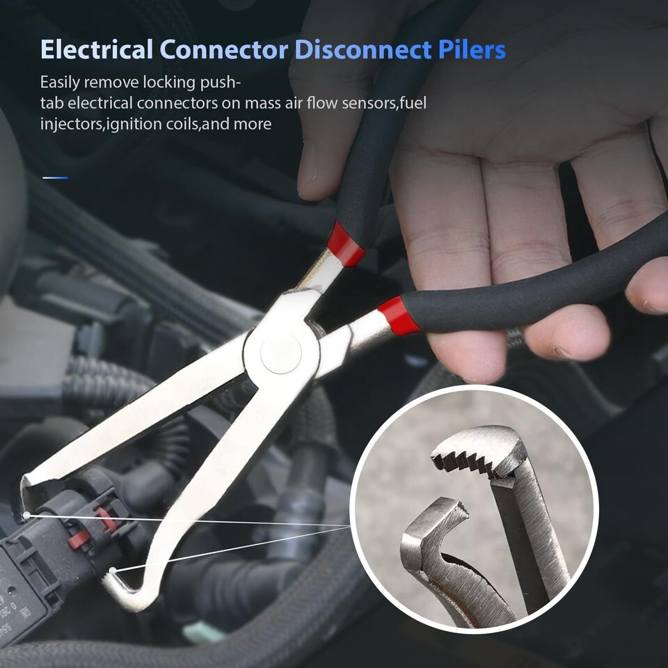 ?Electrical Disconnect Pliers?Connector disconnect guides, easy removal of mass air flow sensors, fuel injectors, ignition coils and electrical connectors with locking push tabs on ECU connectors, HVAC sensors and trailer light systems