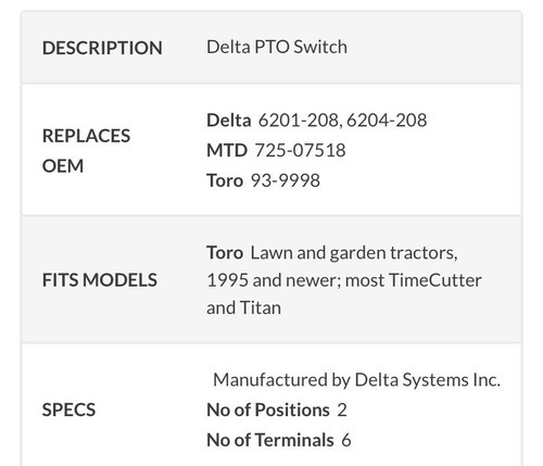 Delta 6204 Series 6 Blade Terminals 1.5? Diameter Knob PTO Pull Switch 6204-208.