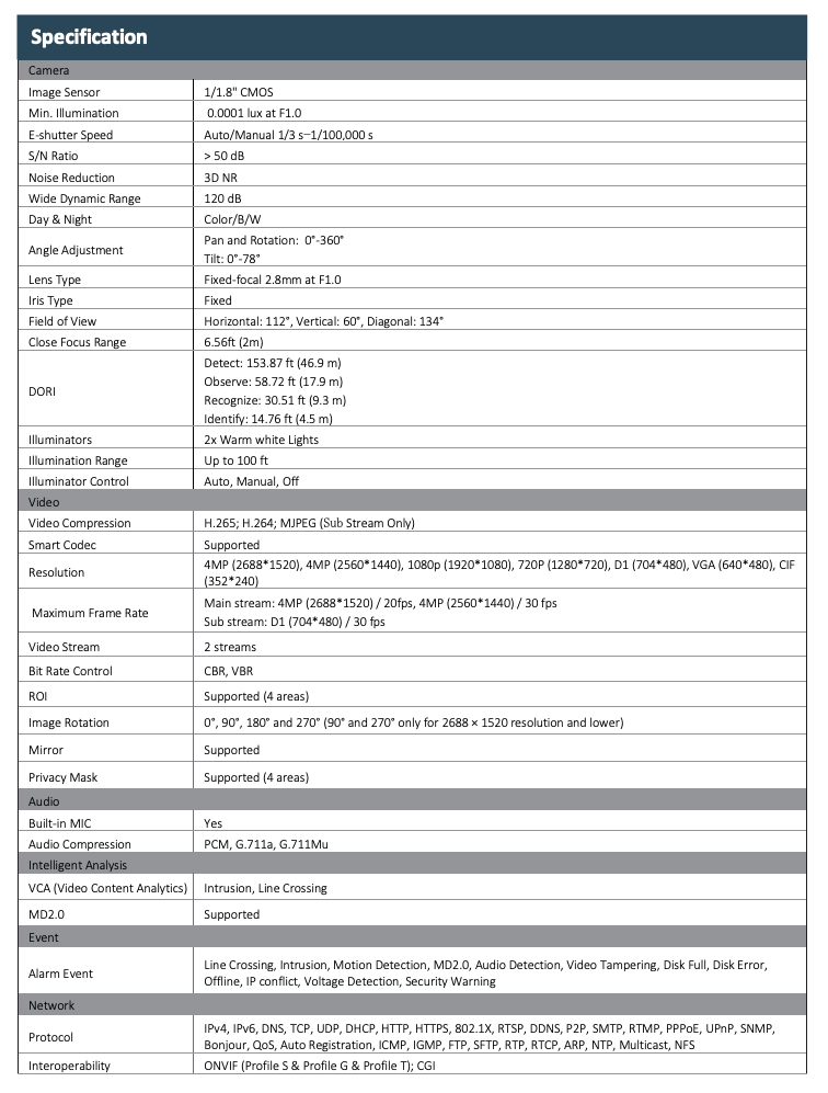 Pro-X, IP, 4MP, 1/1.8" , F1.0, 2.8mm, AI ISP Turret, Built-in Mic, Full-color,VCA, MD2.0