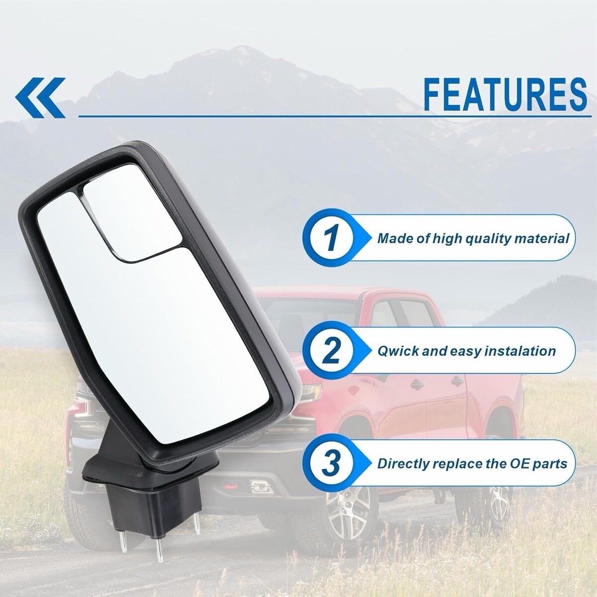 Replacement driver-side left mirror assembly, direct fit for the Chevrolet Silverado 1500 (2019-2025). Features power-adjustable heated mirror glass, textured black housing, manual folding (no turn signal lamp). Built to meet or exceed OEM standard for fit and finish. Replaces factory part number GM1320583.