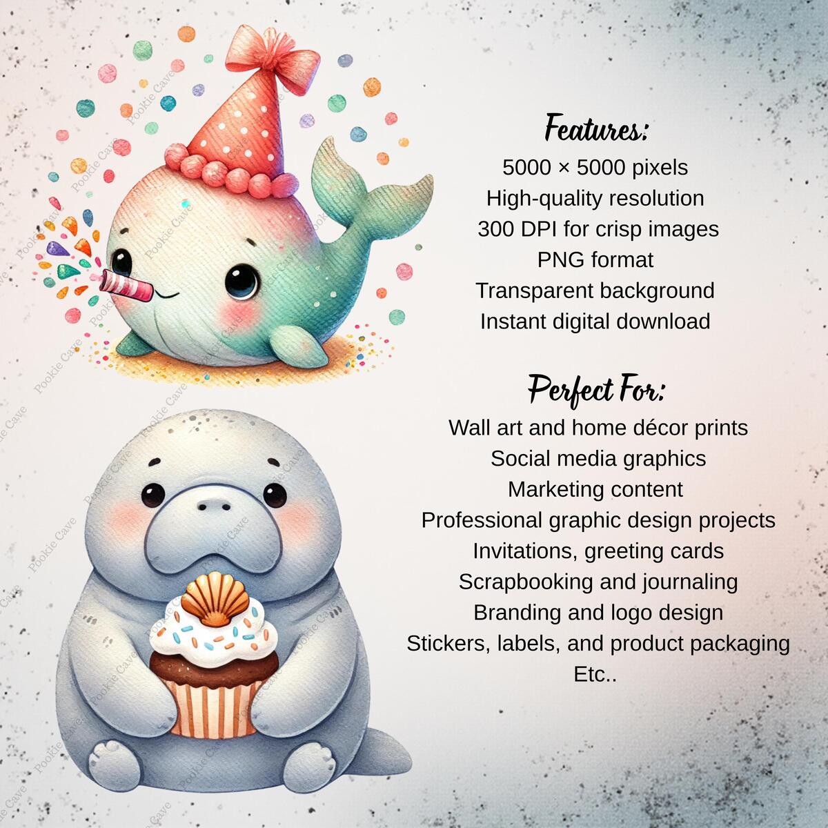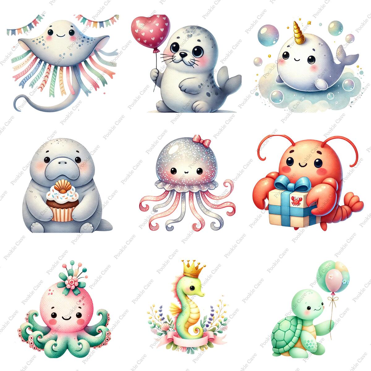 This adorable Under the Sea Birthday Clipart Bundle includes 37 watercolor ocean animals, perfect for kids’ parties, baby showers, invitations, scrapbooking, sublimation, wall art, and more.