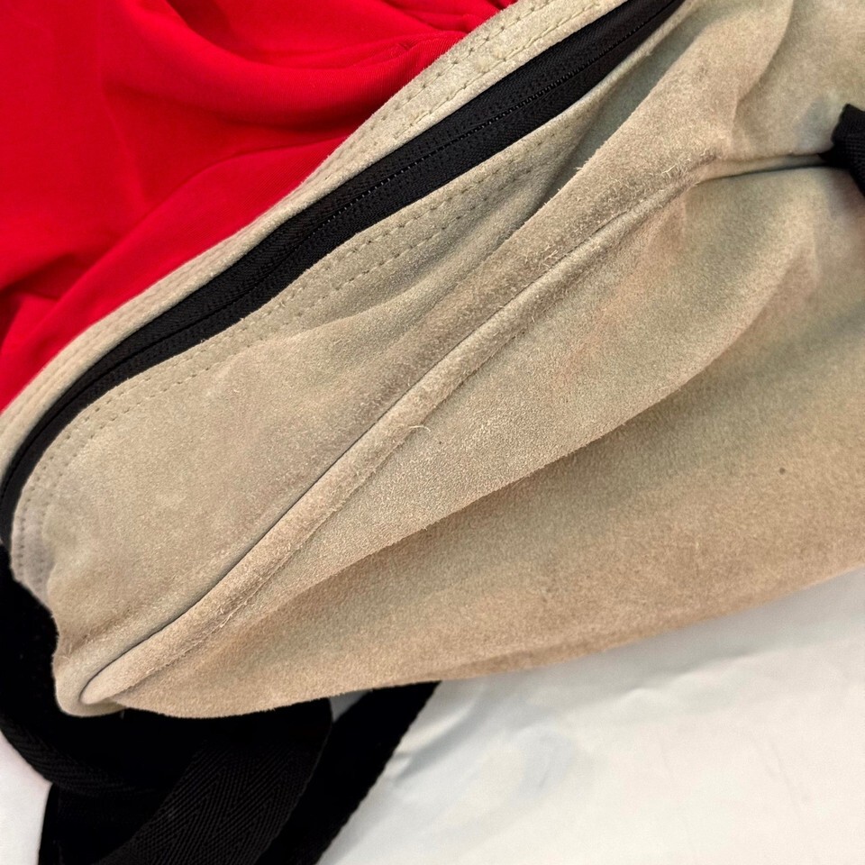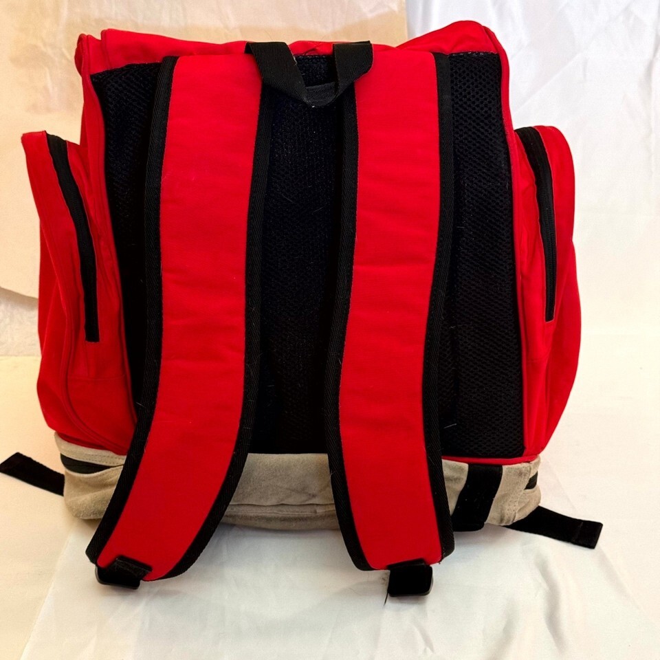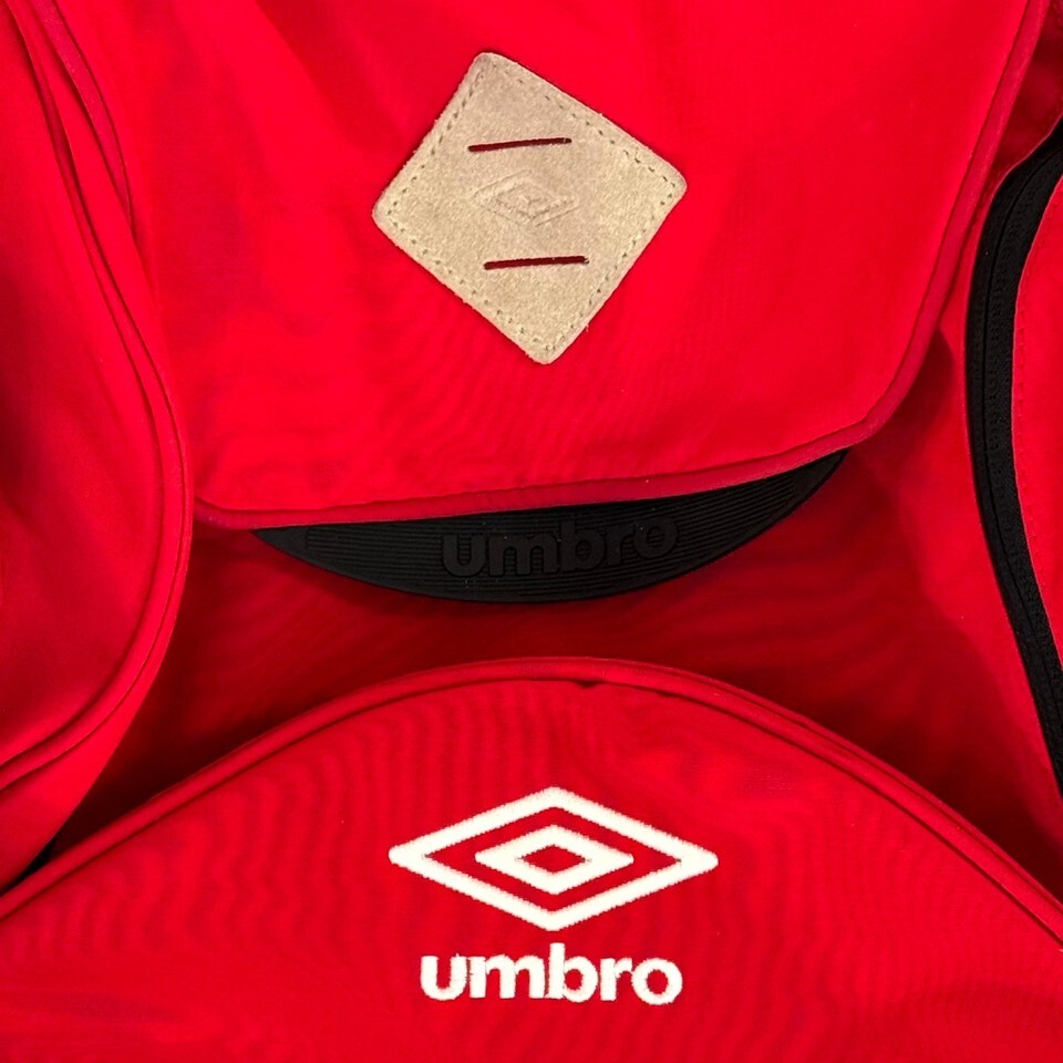 Authentic Umbro athletic backpack in bold red with a unique suede bottom panel. Sized approx. 16" H 15" W 8.5" D. Clean overall with no rips, tears, or stains on the red body. All zippers and compartments work perfectly. Suede base shows some soiling from use (see photos) but is structurally solid.
