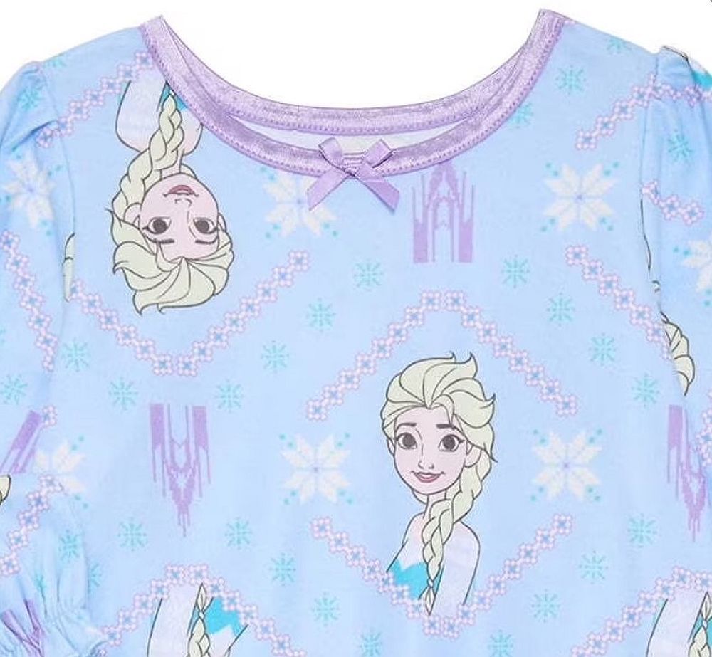 This lovely light-blue gown is covered in a whimsical pattern of Queen Elsa's smiling face (complete with her iconic braid!) and Frozen icons sprinkled throughout. It features cozy long sleeves with sweet ruffled cuffs and a matching ruffled hemline, perfect for twirling before bedtime. Featuring a purple satin trim and a bow at the neckline, this nightgown is perfect for any young royal who wants to feel warm, comfortable, and ready to 'Let It Go' into a night filled with icy adventures and sweet dreams!