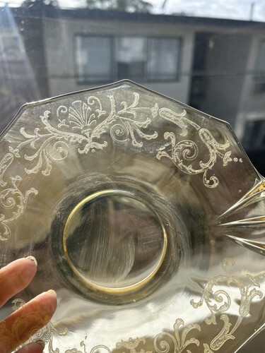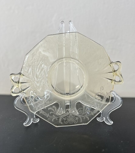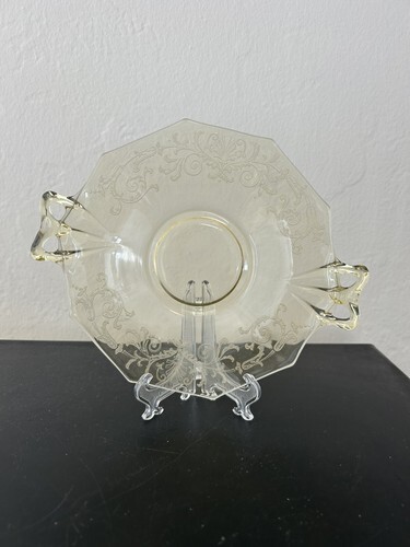 This Fostoria Versailles Topaz Yellow #2375 8 1/2? Bow-Handled Lemon Plate is a vintage elegant glass plate with an etched pattern. It has a glossy finish and is hand-blown. The plate diameter is 6 7/8? and it weighs 9.4oz. The plate is an antique original from the early 20th century (1911-1940) and is a type of plate that is perfect for serving lemon.