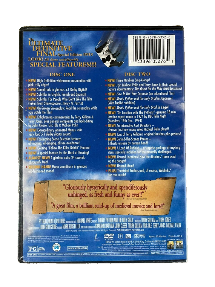 The product is a brand new, unopened DVD of the classic comedy movie "Monty Python and the Holy Grail" released in 1975. Directed by Terry Gilliam and Terry Jones, this PG-rated film has a run time of 89 minutes. Produced by Adam Goldworm, Andrew Deane, Ben Browning, Grant Rosenberg, Mark Forstater, and Michael White, the DVD is in English language and falls under the genre of Comedy Video. It is distributed by Sony Pictures.