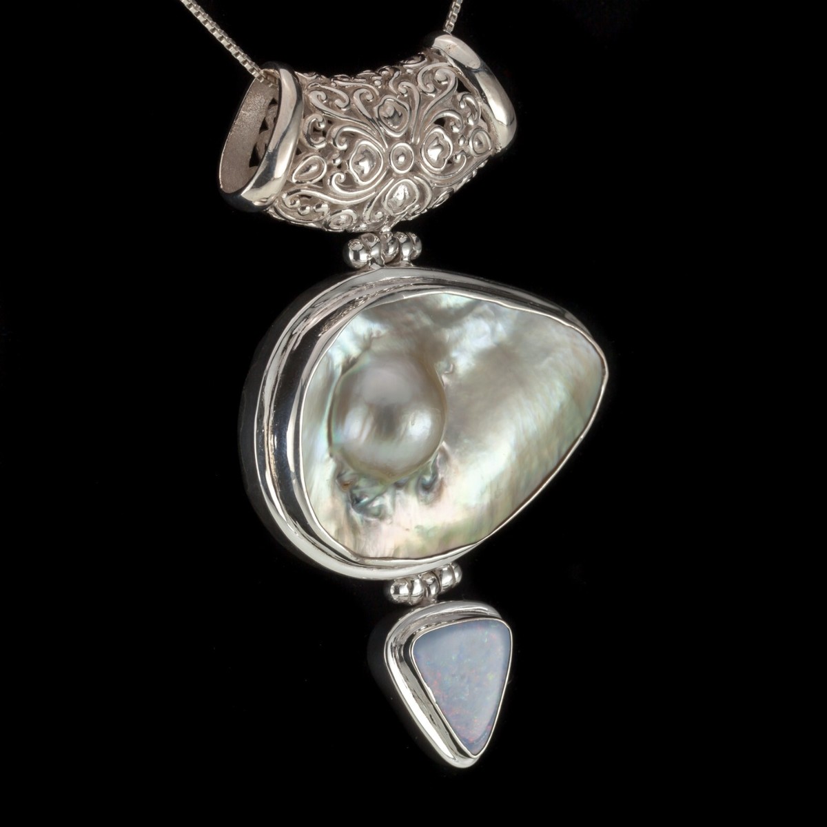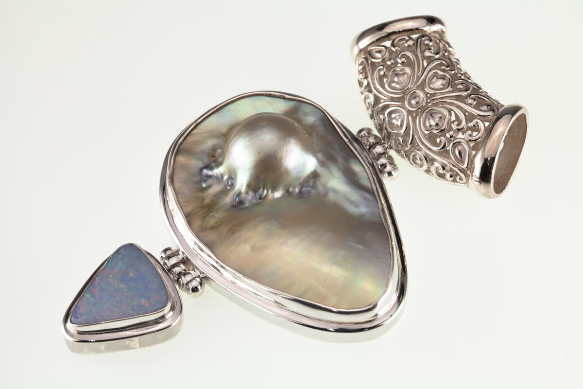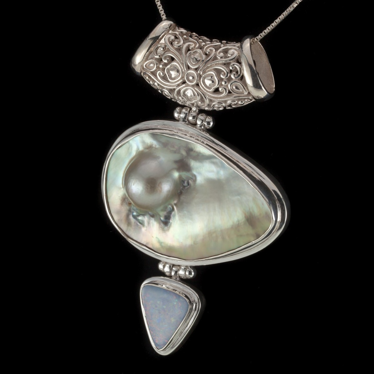 Design features a large chunk of Mother of Pearl with a 3-D Pearl bubble catching your eye. Smaller triangle Faux Opal below MOP setting.