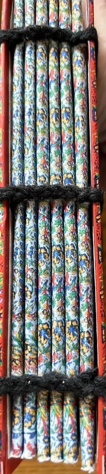 This hardbound journal features a stylized Tree of Life on the front and back.The blank pages are bound by the dozen featuring the same pattern at the border of the first and last of the dozen pages. The rest of the pages are blank and take a pen, pencil, drawing pencil or charcoal very well. About 72 pages (or 144 counting front and back). The elastic closure wraps around a button on the front to hold your secrets tight within.