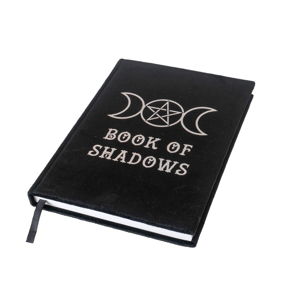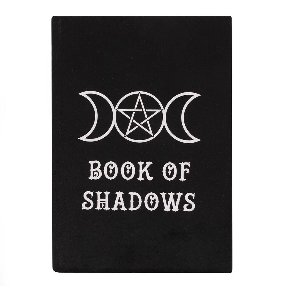 This Triple Moon and Pentagram Book of Shadows has been finished in a velveteen material, giving it a soft and luxurious feel. Measures approximately 5.8 X 8.2 X .66 inches with 100 (200 counting both sides) lined pages and a matching black ribbon place marker.