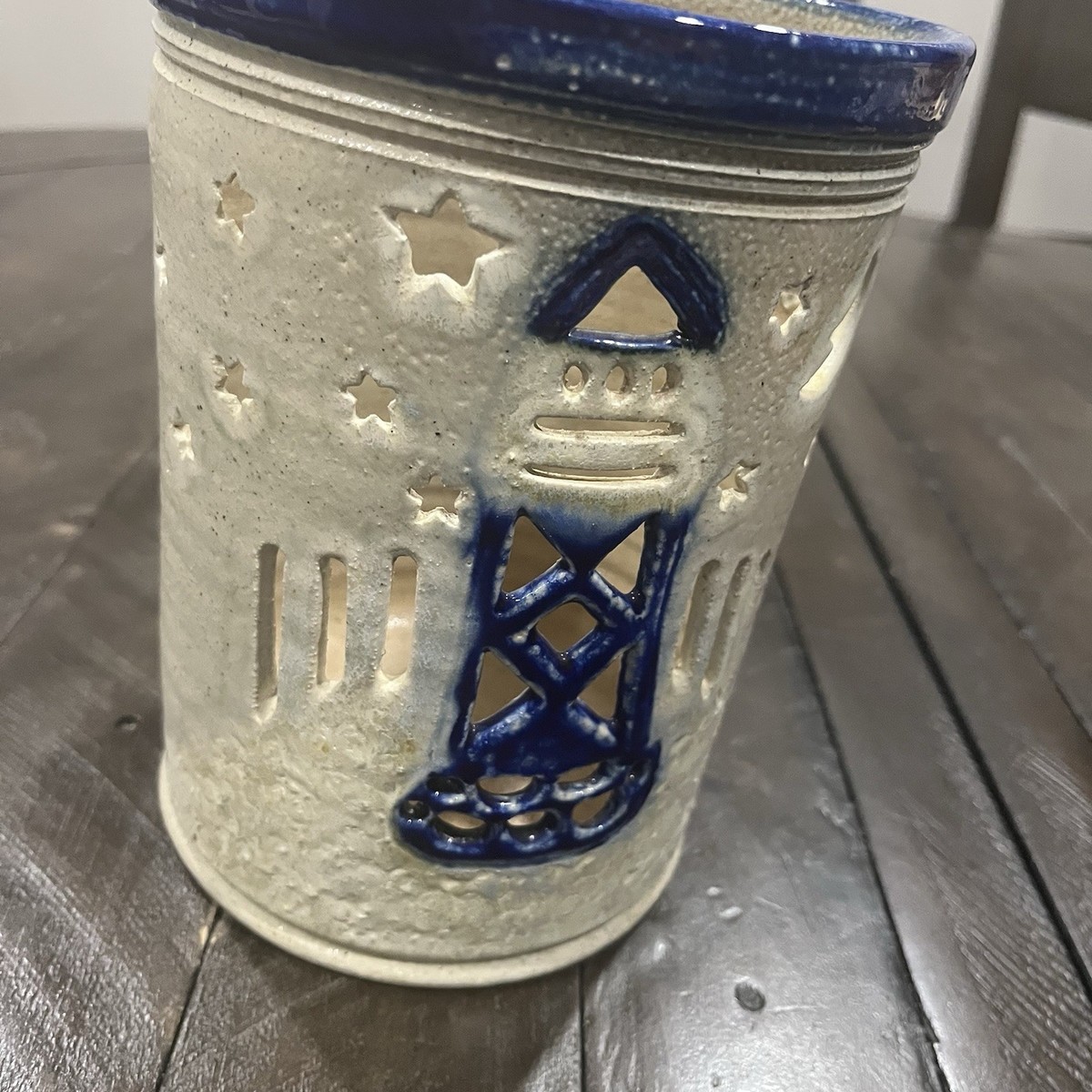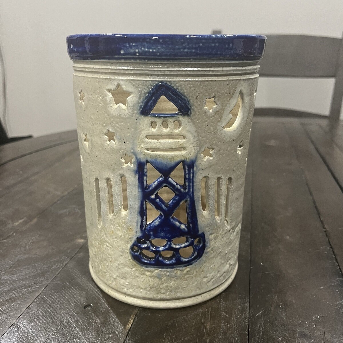 The VTG Salt O Thee Earth Salt Glaze Pottery Lighthouse Stars Lamp is a unique candle holder made of ceramic with a beautiful blue color and a lighthouse theme. Produced in 2002 using pottery techniques, this art pottery piece is signed by the artist Jax. The salt glaze gives it a special texture and appearance, making it a standout decorative item for any home. Perfect for adding a touch of charm and nostalgia to your space, this lamp is a one-of-a-kind piece that will surely be a conversation starter.