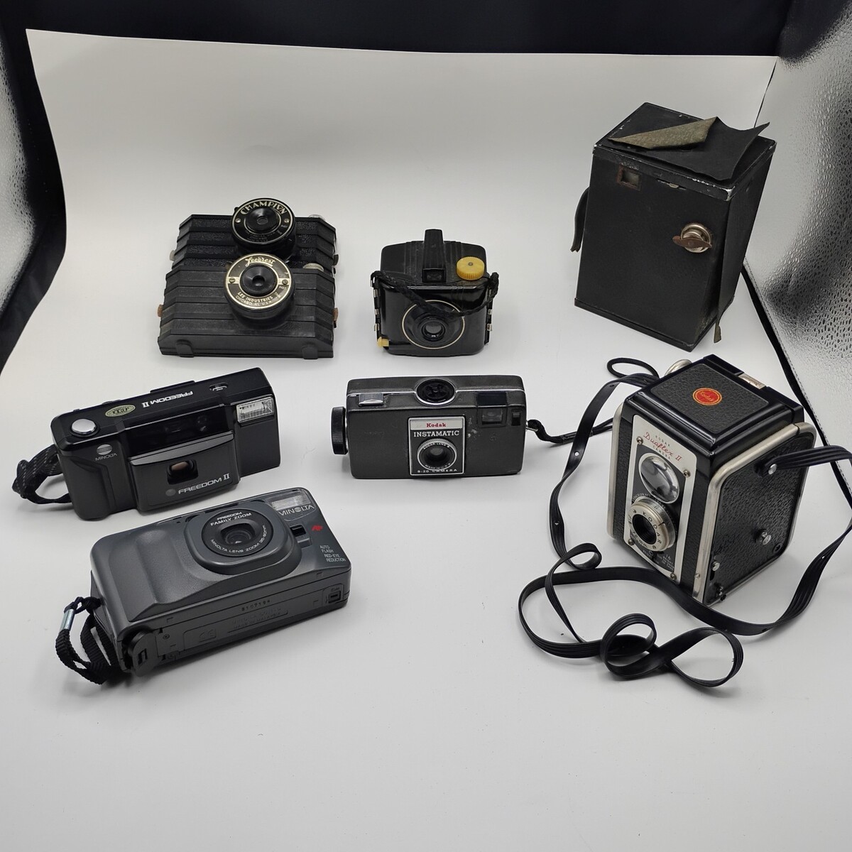 - 7 assorted vintage cameras (Kodak, Fujifilm, box, folding, and compact models)
