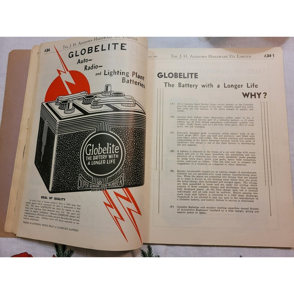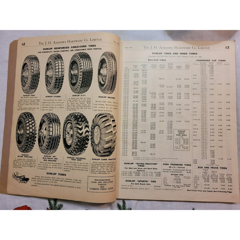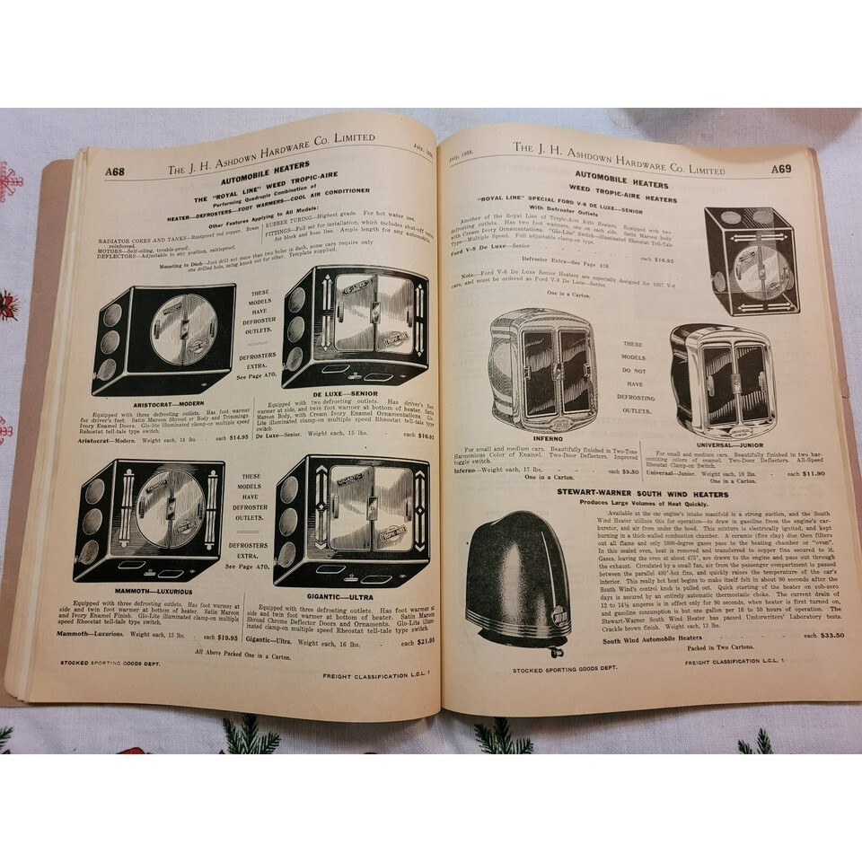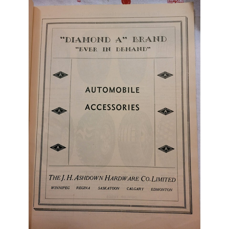 Very cool, very rare vintage July 1938 Automobile Accessories Catalog. Produced by The J.H. Ashdown Hardware Company Ltd. which had warehouses in Canadian cities of Winnipeg, Regina, Saskatoon, Calgary and Edmonton. This is a very cool catalog filled with prices of all kinds of car accessories and hardware. It is a stapled bound catalog with 152 pages and is all complete with no missing pages. A very rare find of paper Ephemera!! Selling in as is condition but still complete and great shape for age. You can read everything perfectly in the book. Amazing automobile history!