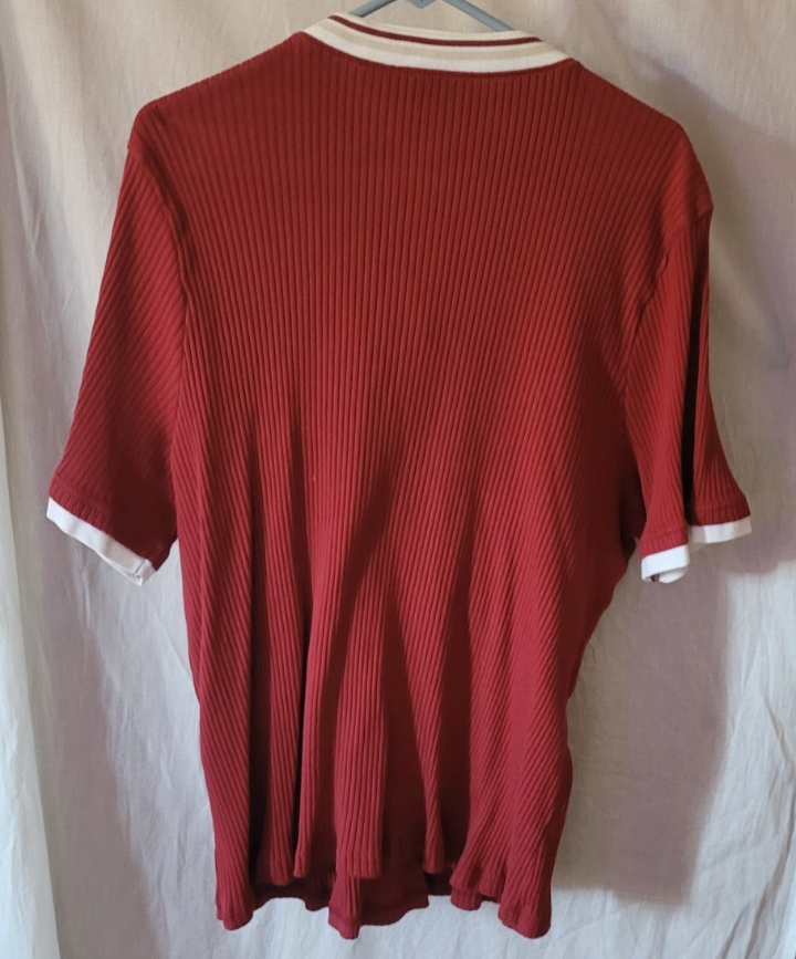 This shirt is in good used condition. There are no holes or stains that I found. The size is 26/28. Measurements are approximately: Length: 28 inches. Pit to Pit: 30 inches.