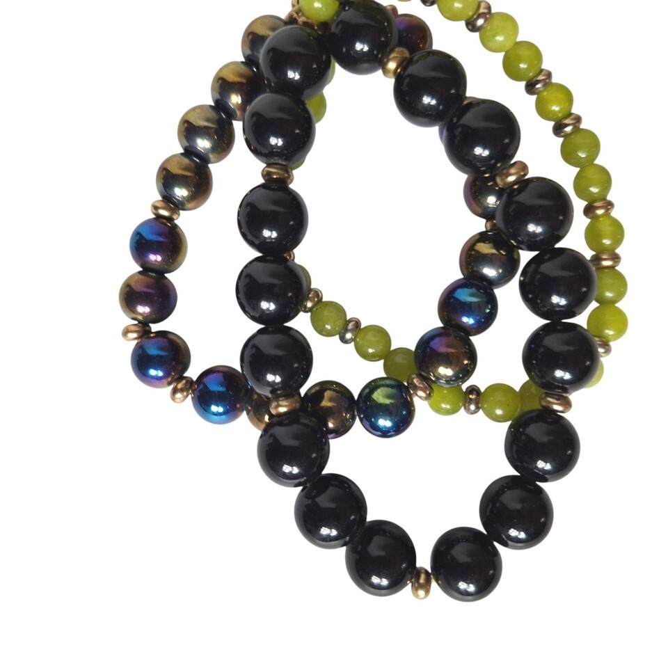 Vintage Dark Academia Bracelet Set Black Oil Slick Iridescent Green Leaf Charm