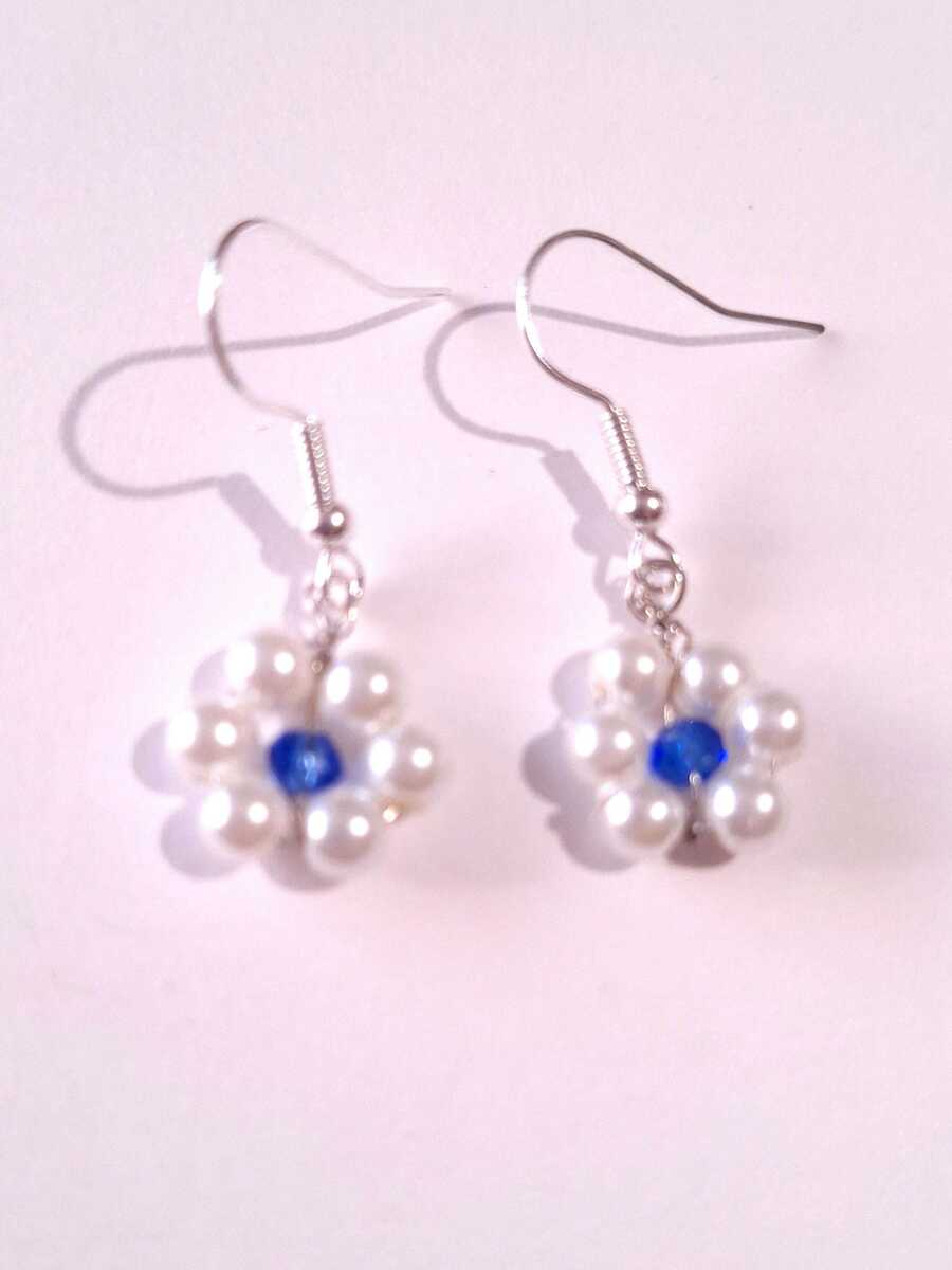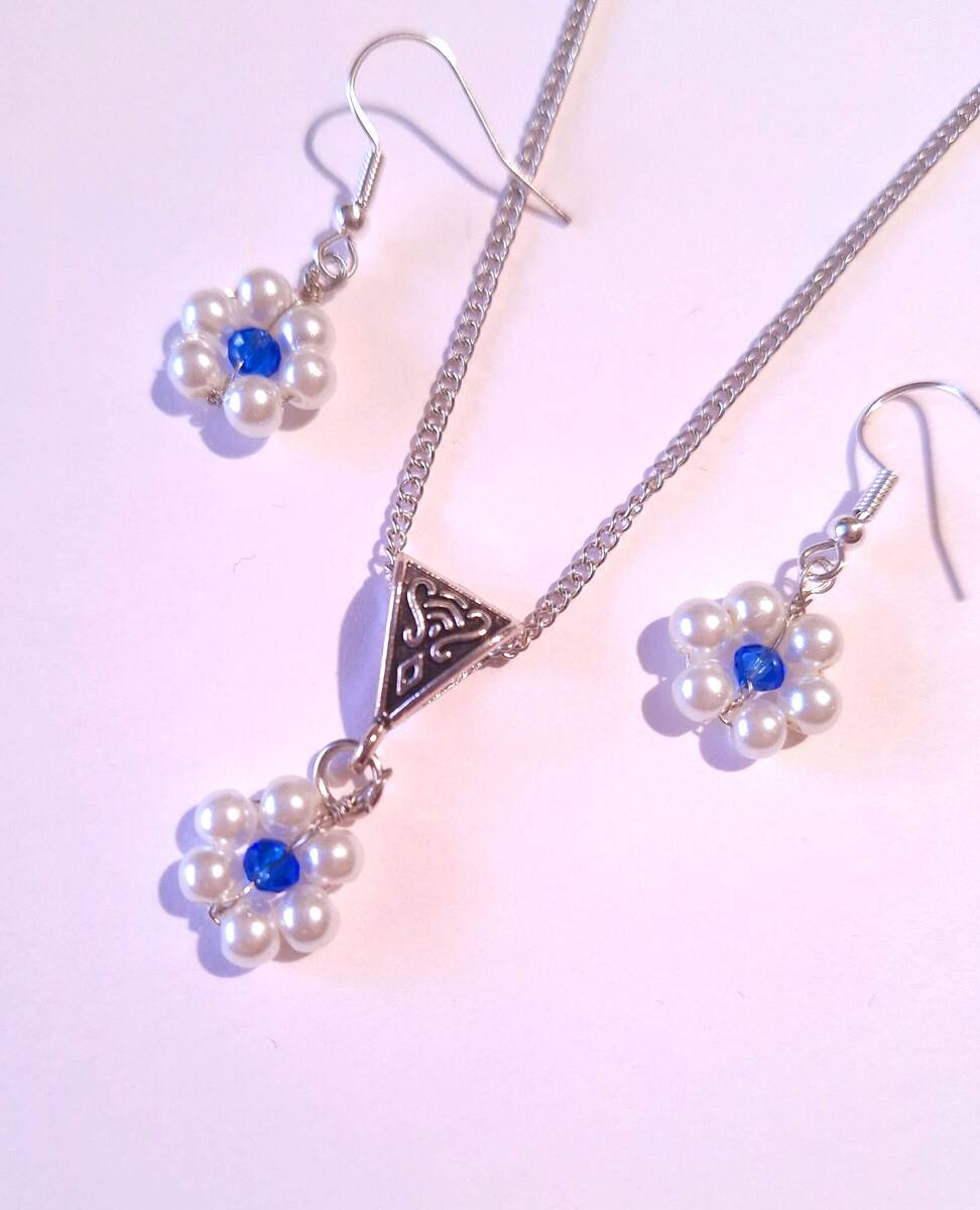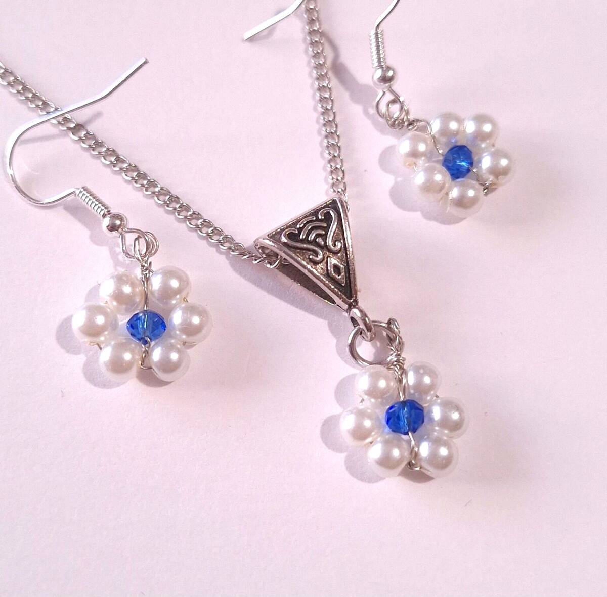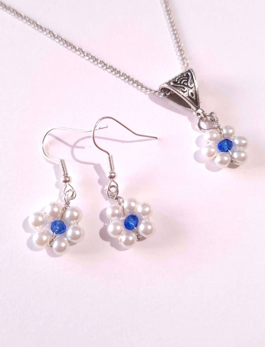 flower pearl silver jewelry set bohemian jewelry set earrings necklace Boho set white pearl and blue crystal forget me not flower set bridal jewelry set gift set