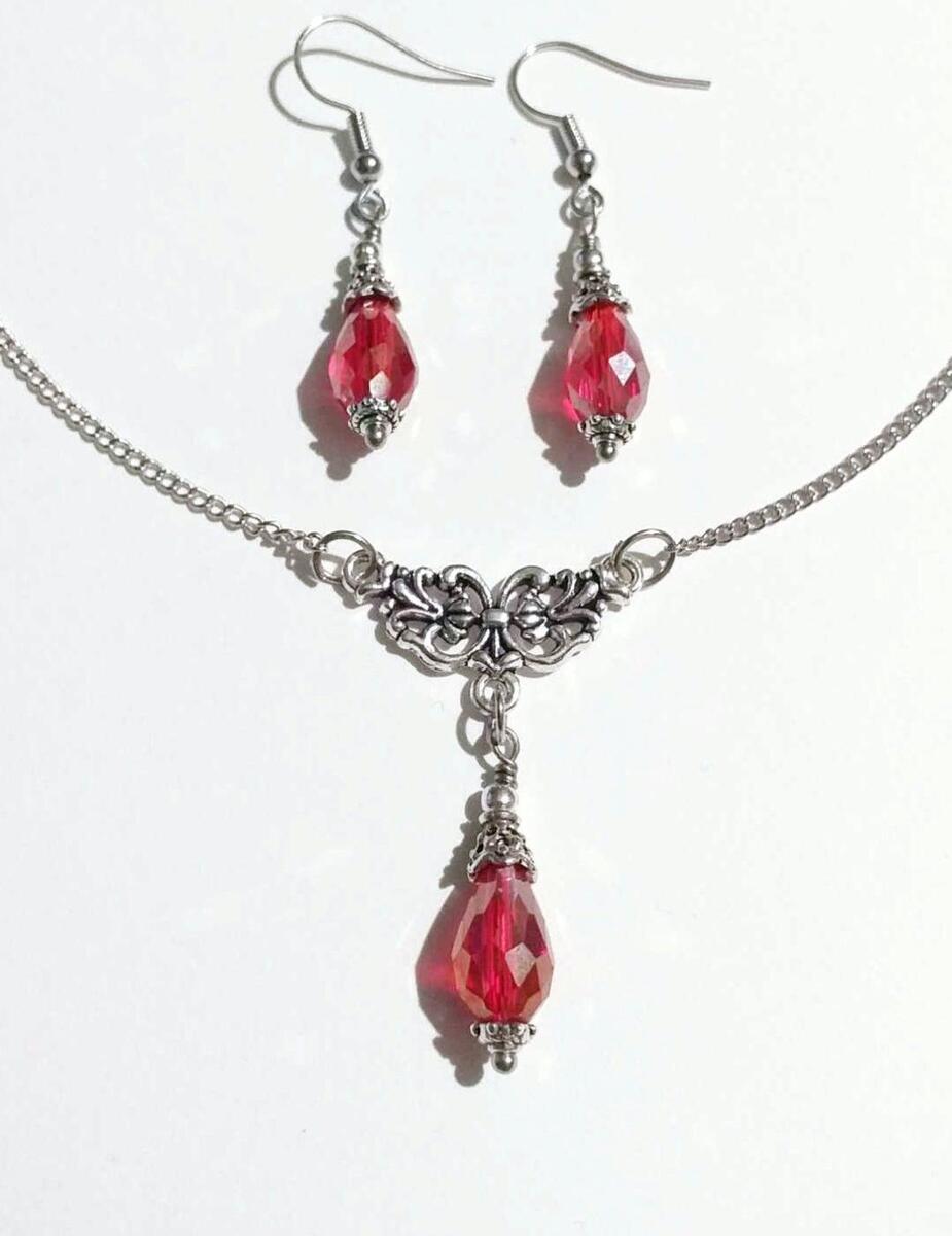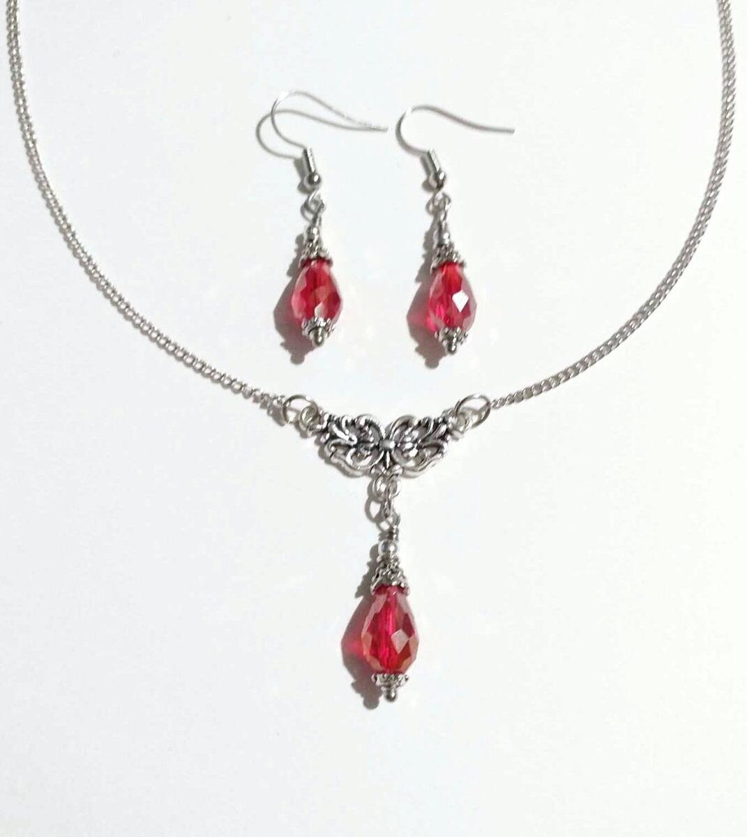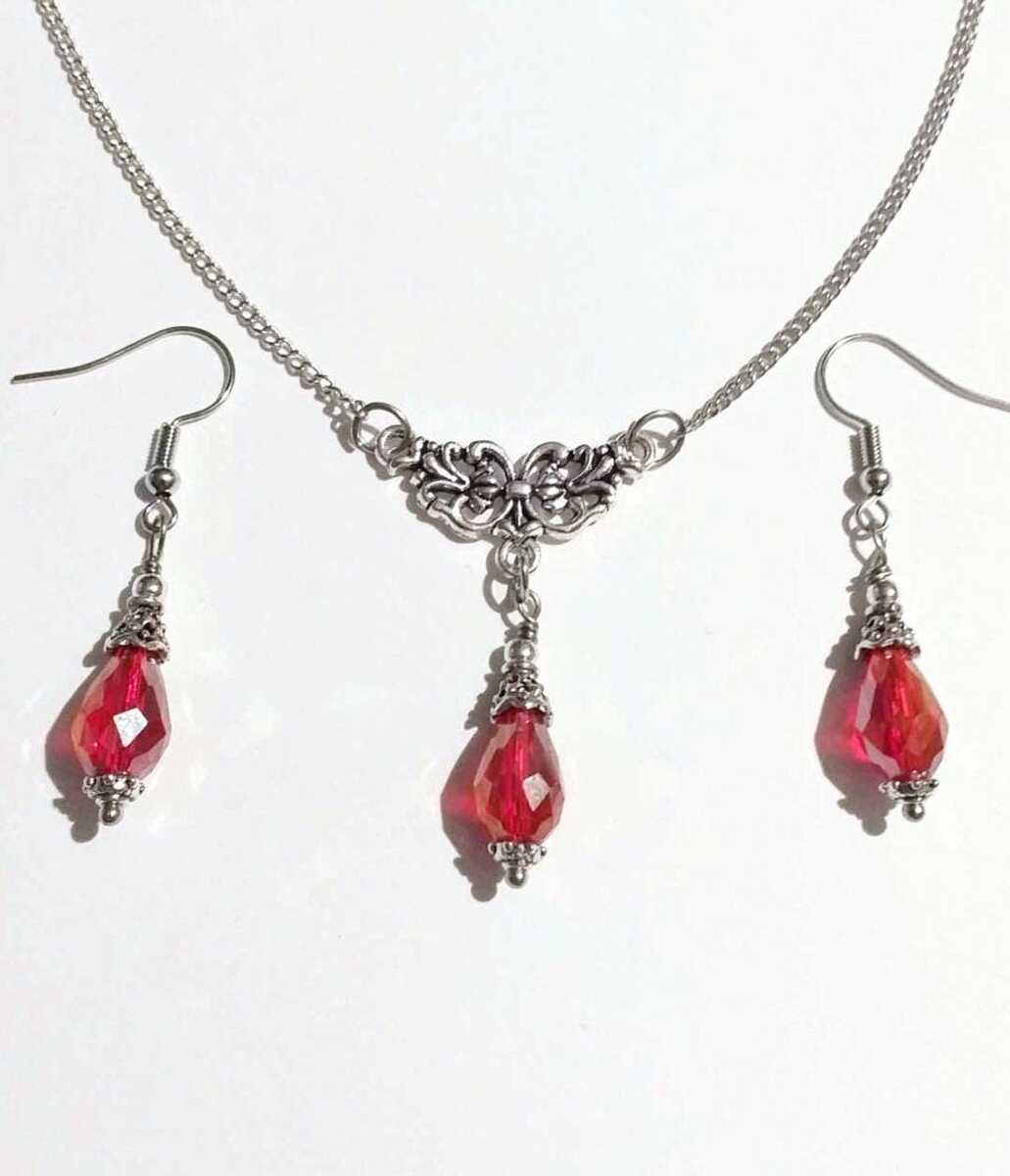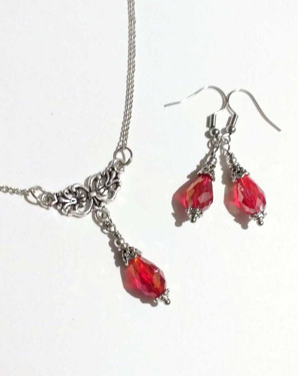 Beautiful Set of silver-tone Antique style red Chameleon fine faceted teardrop shaped Crystal beads necklace and earrings. Silver-tone pendant Victorian style necklace and earrings. Boho necklace. Bohemian necklace and earrings. Romantic necklace and earrings. Beautiful necklace with same style earrings with filigree ornaments and fine red faceted crystal beads .
