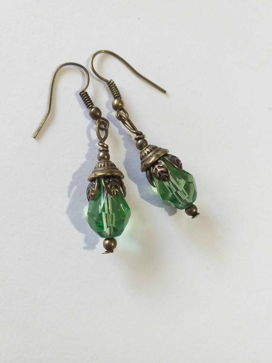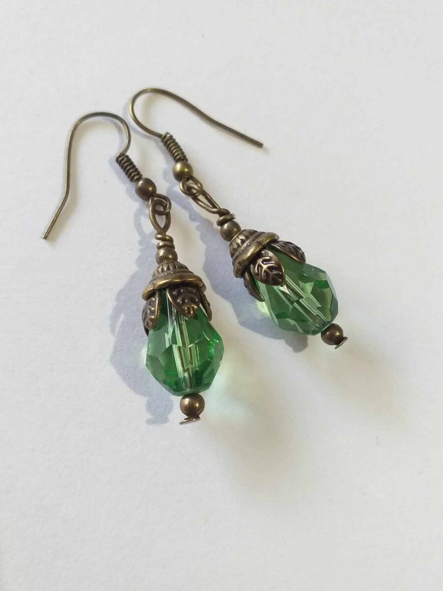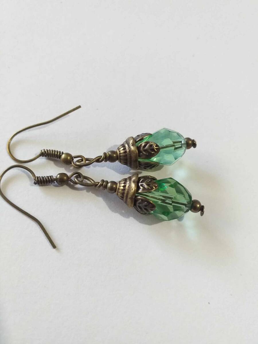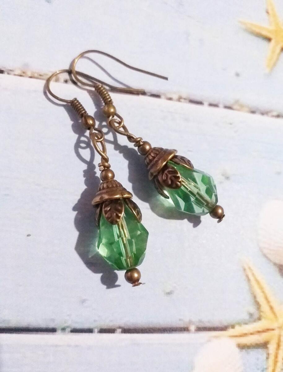 Beautiful bronze Victorian style earrings with emerald green teardrop faceted glass beads. Antique style bronze tone Emerald green filigree earrings . Boho earrings. Bohemian earrings . Romantic style earrings. Baroque style earrings . Beautiful emerald-green earrings.