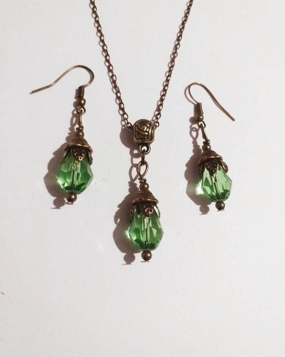 Material: bronze tone pendant, green teardrop faceted glass beads, bronze tone chain , bronze toned ornaments beads.