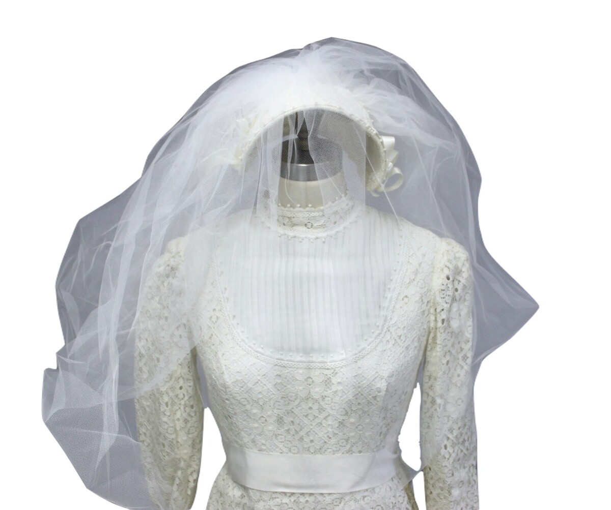 Vintage 1960s-70s-Wedding Gown Ivory Lace Empire Waist Train Veil Trousseau sz 6