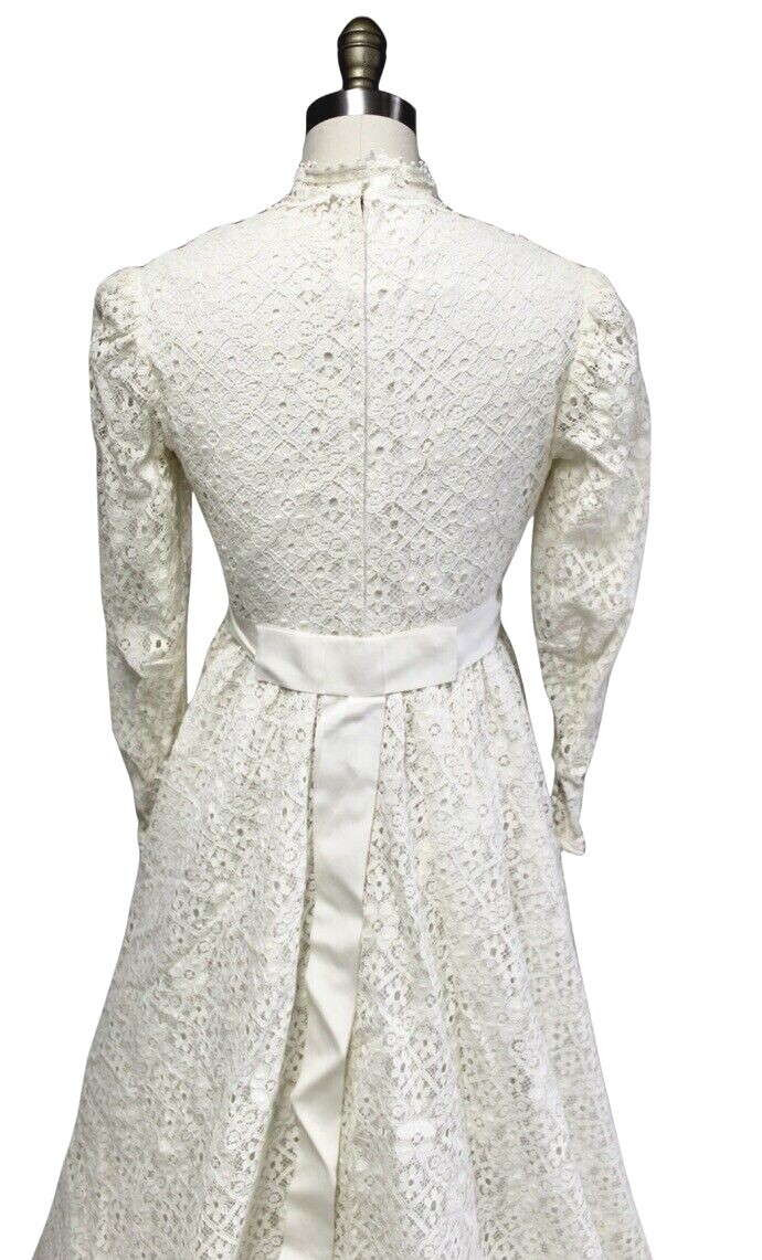 Vintage 1960s-70s-Wedding Gown Ivory Lace Empire Waist Train Veil Trousseau sz 6( fits the size 6 mannequin like a glove)