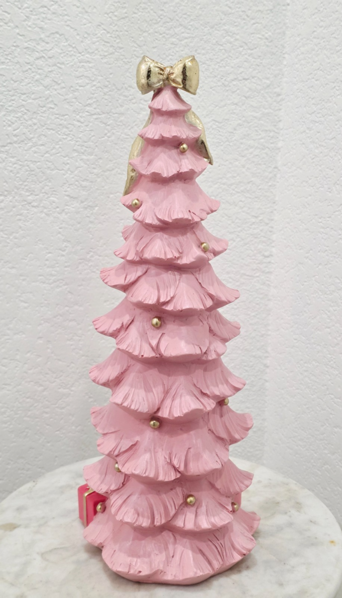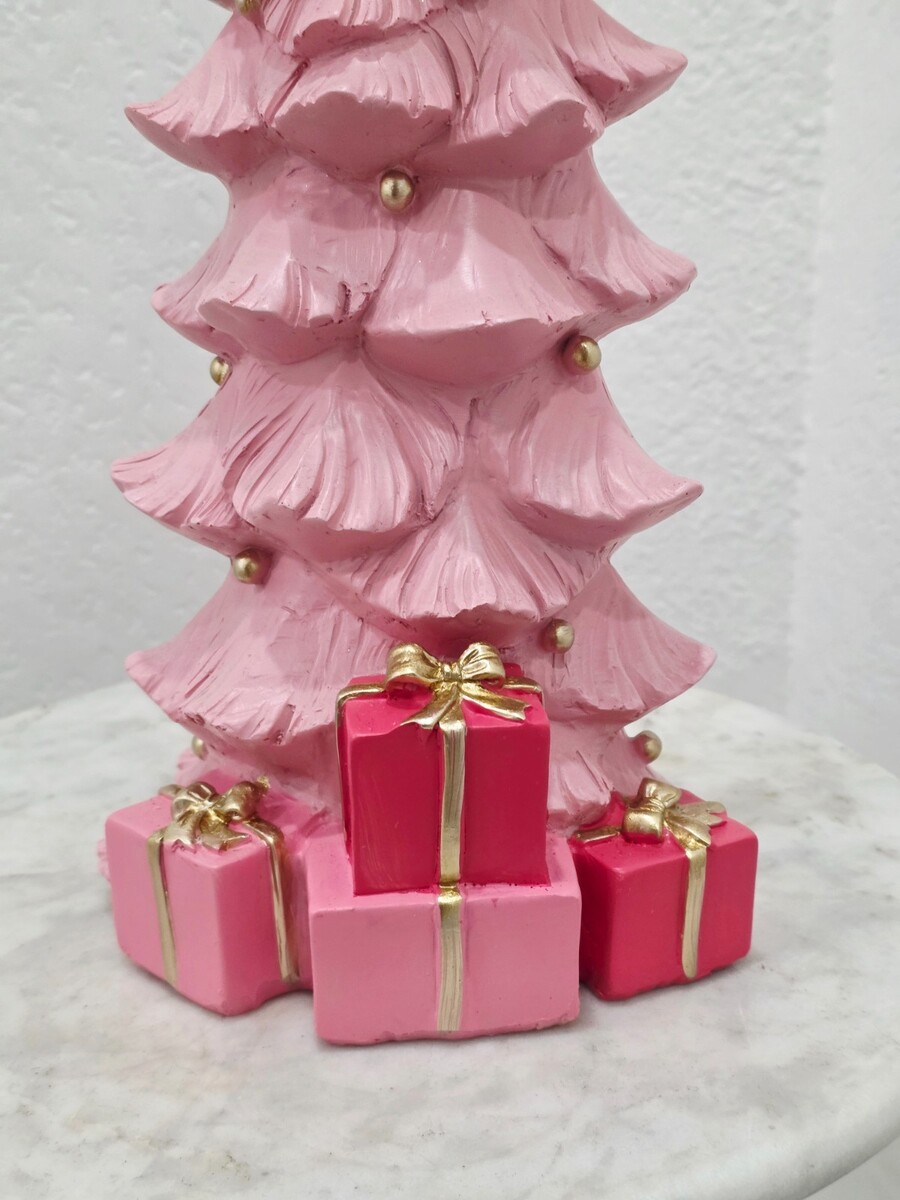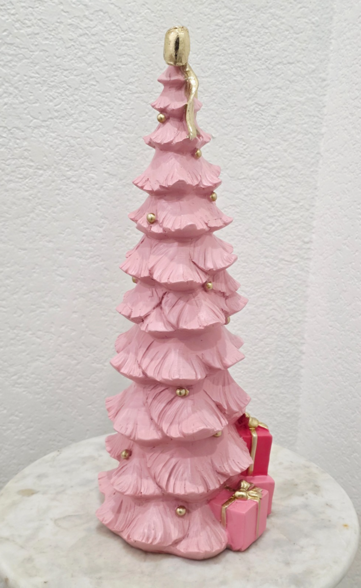 Up for sale we have this gorgouse pink tree with a gold bow and presents underneath the tree. This piece will look amazing with your pink decor. It's made of resin and stands approx 15" tall. New