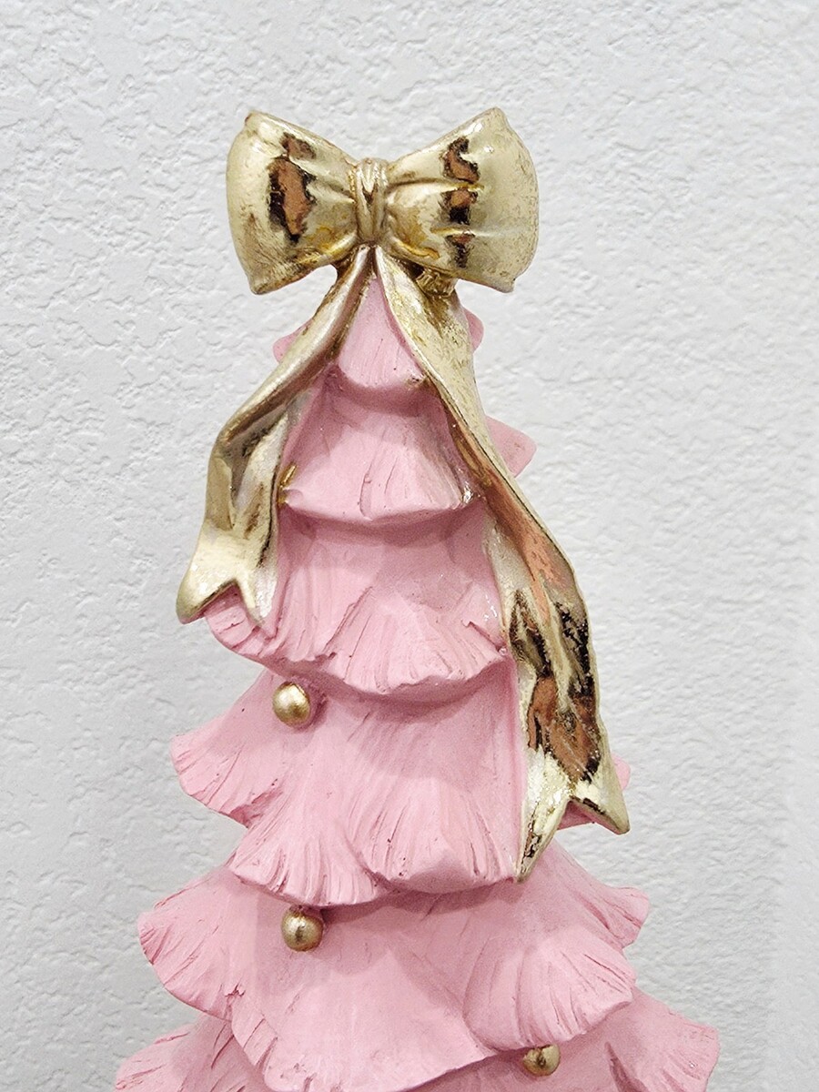 Christmas Coquette Pink Tree With Gold Bow Presents Figurine Tabletop Decor 15"