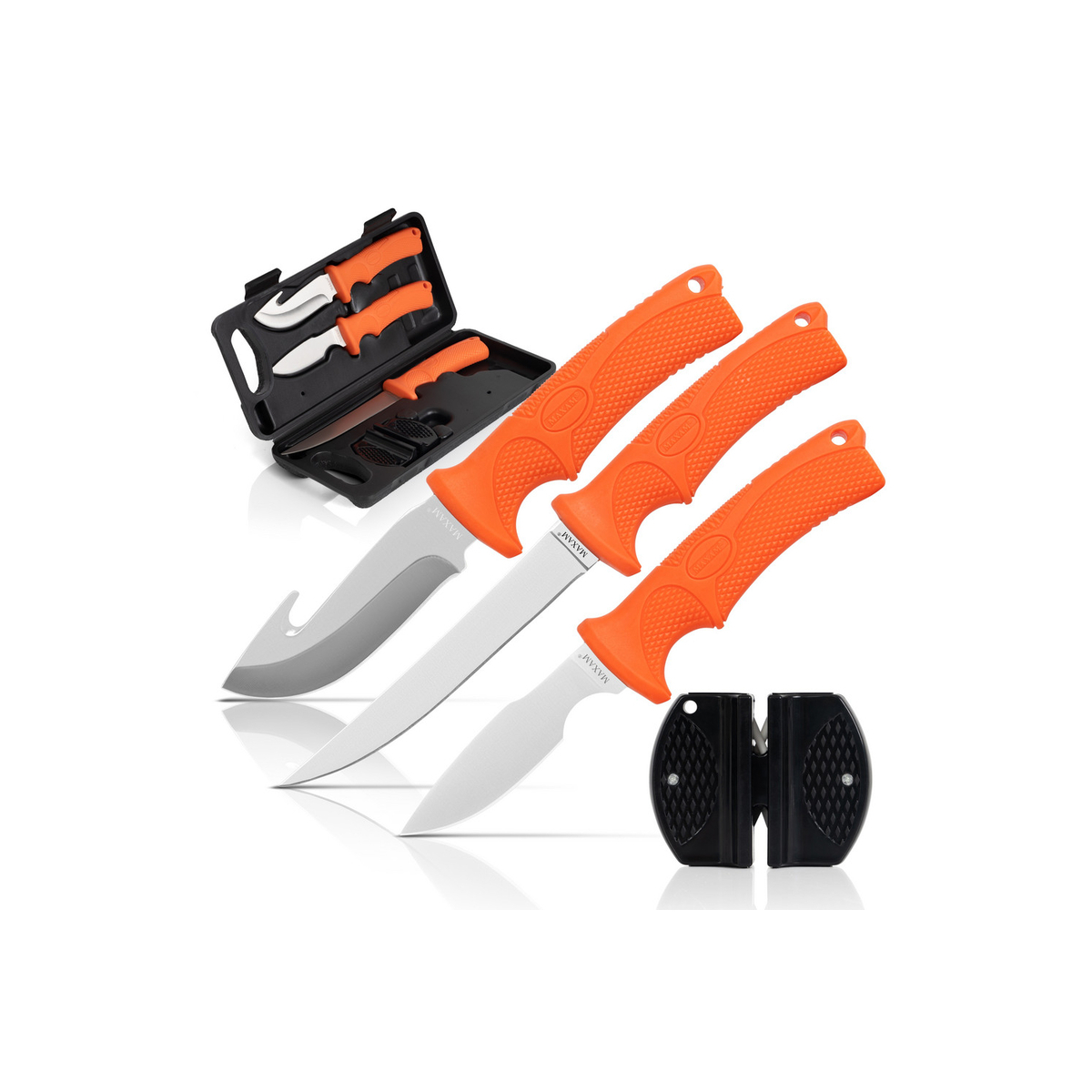 Maxam 5pc Fixed Blade Skinning Knife Set. Skinning Knife, Caping Knife, Boning/Filet Knife, Knife Sharpener, Storage Case. Bright Hunter Orange Non-Slip Handles, Satin Finish Stainless Steel Blades