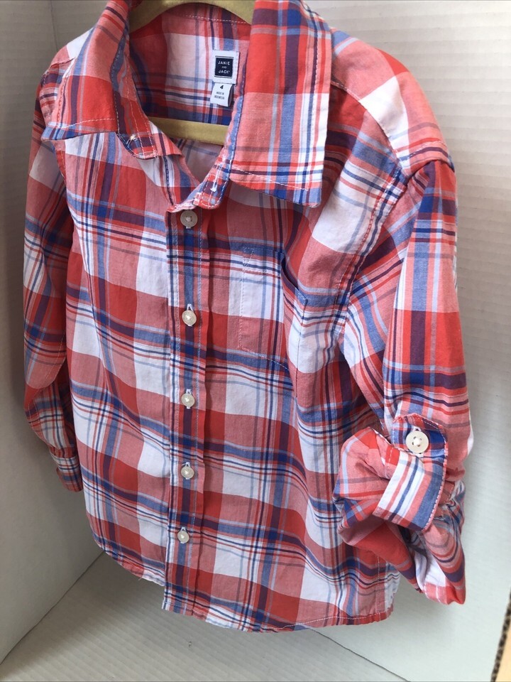 Janie and Jack Toddler Button Up Plaid Shirt Size 4 Red White Blue Lonng Sleeve
