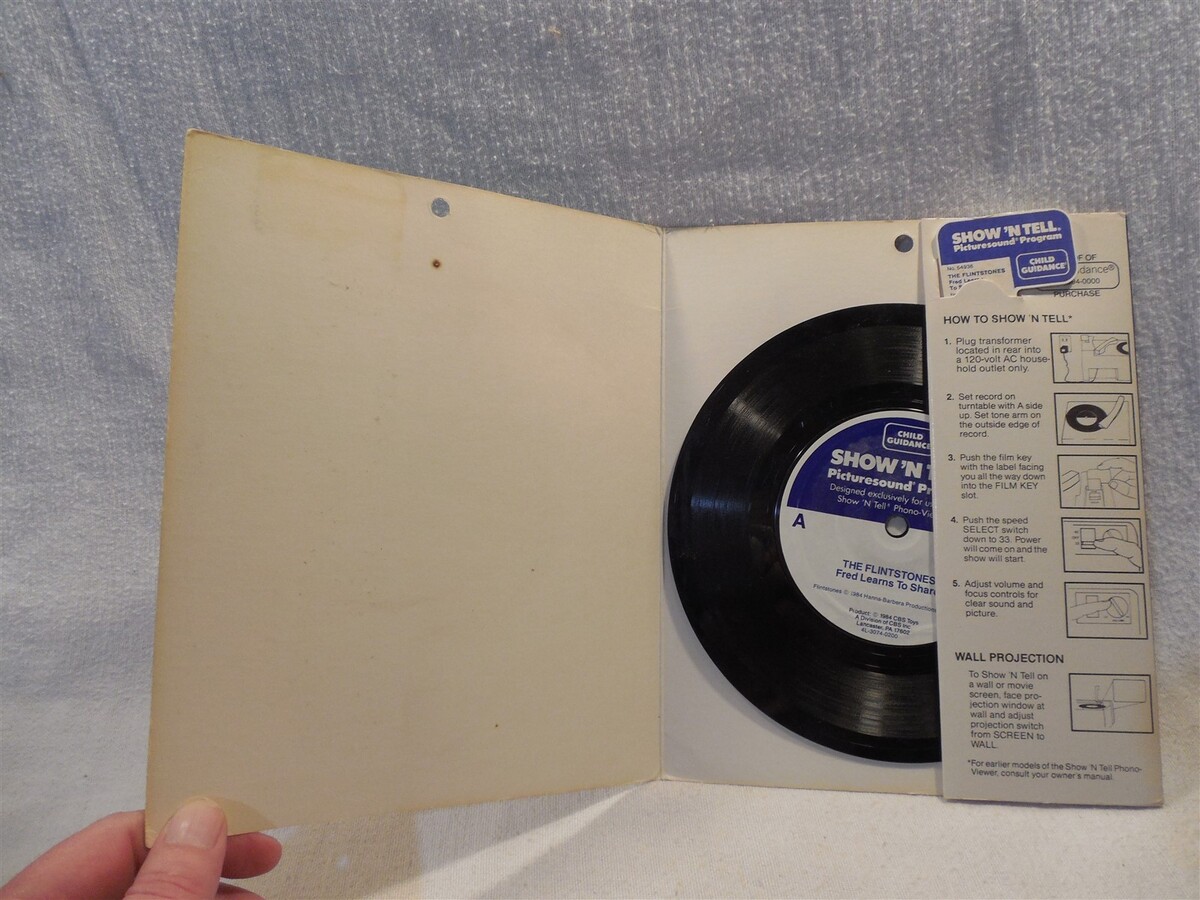 This is a Flintstones 1984 Child Guidance Show 'N Tell Picturesound Program. The cover contains a record and filmstrip designed for the Show 'N Tell phone-viewers. This program is titled "The Flintstones - Fred Learns To Share". The heavy paper folder measures approximately 7" x 8 1/2".