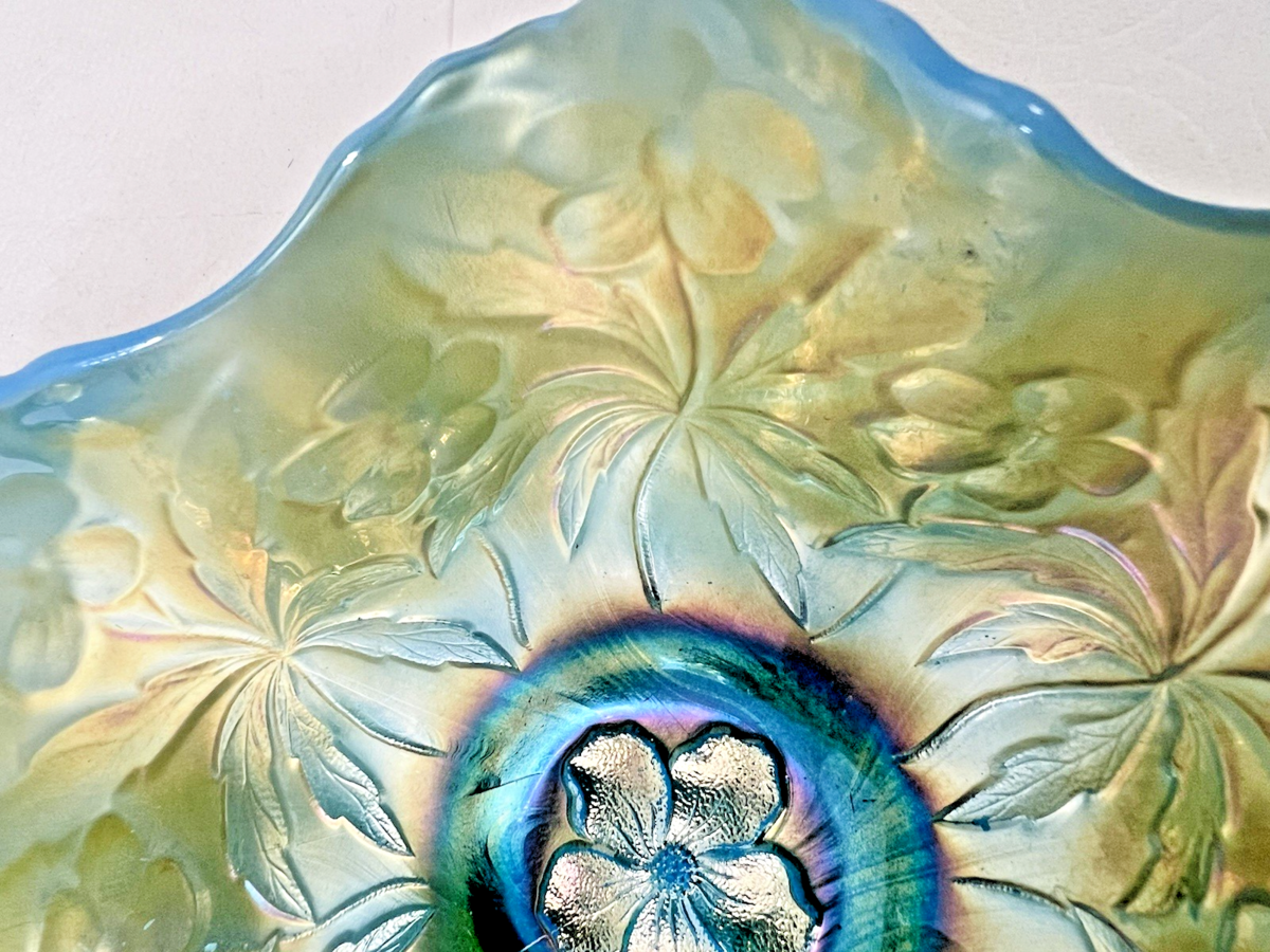 Westmoreland Carnival Glass Carolina Dogwood Ruffled Bowl Icy Light Blue 8 3/4" In great shape no chips or marks