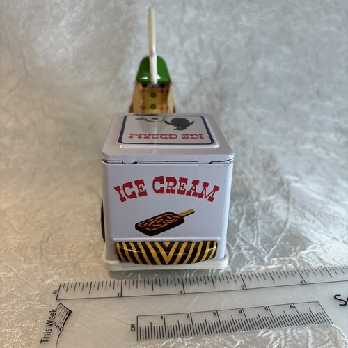 This vintage Masudaya toy from Japan is a must-have for collectors. With its classic 1950s style and pull-back motor, it's sure to bring hours of enjoyment. The toy features an ice cream vendor design and comes with pictures to add to its charm.