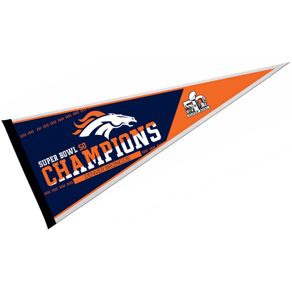 The Denver Broncos 2016 Super Bowl 50 Champs Pennant measures a Full Size 12" X 30" 100% Felt blends, has a left side sewn sleeve, and is single-sided Screen Printed.