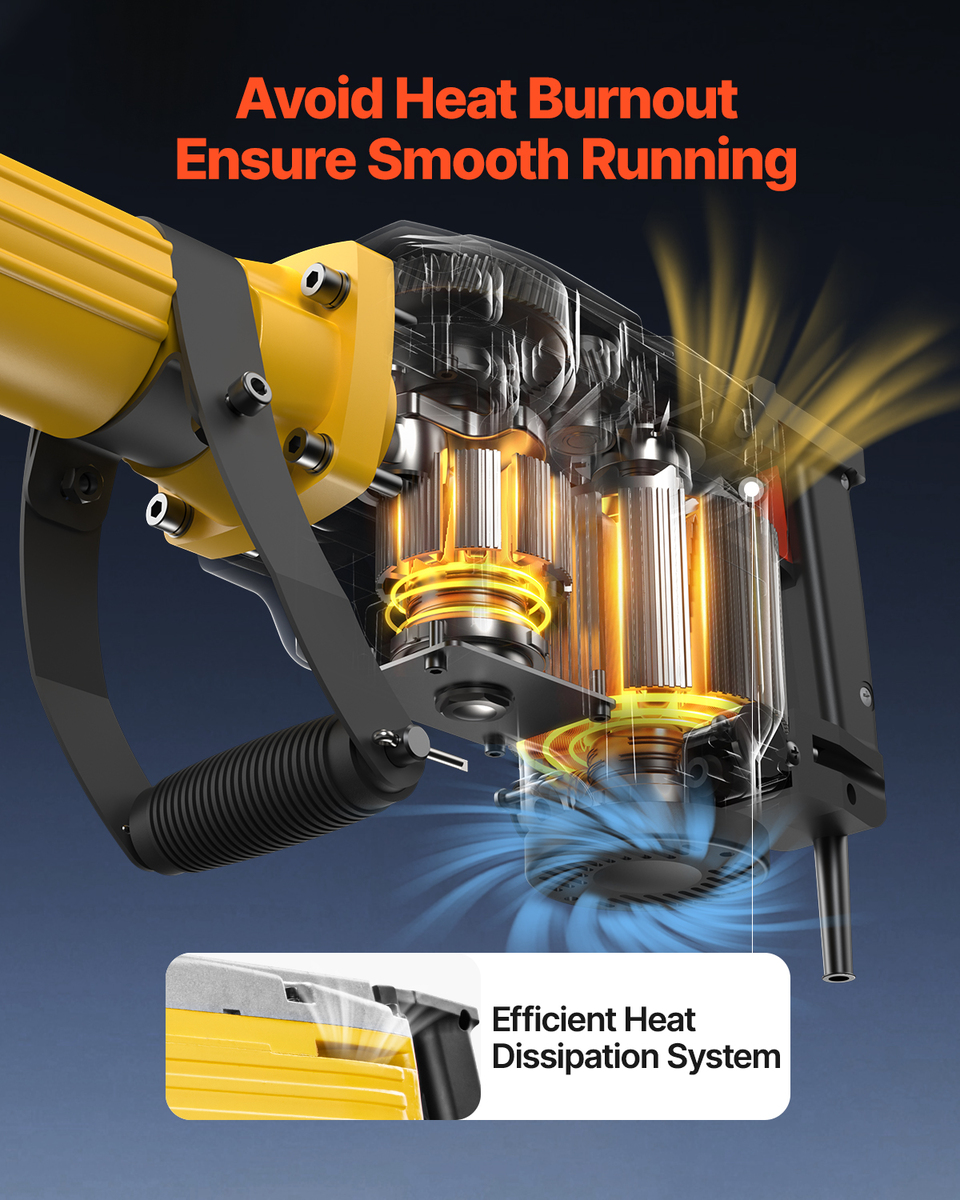360 Rotary Vibration-proof Handle: To cater to different positions under varied circumstances, the 360-degree adjustable fore handle was designed. After seeing its outstanding ability in adjustment, yet, you should not ignore its slip-proof rubber, which greatly enhances friction and absorbs vibration to achieve full control of the electric hammer and a delightful work experience.
