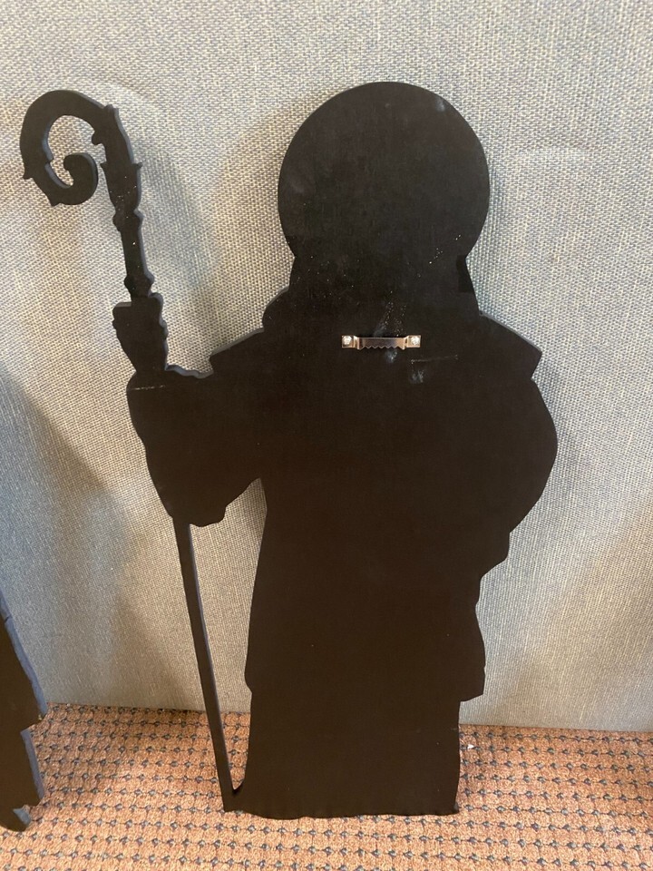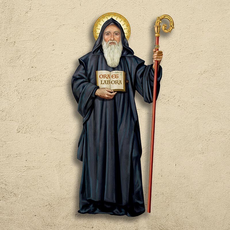 You are purchasing the most beautiful image set on wood of Saint Benedict This plaque measures: 33" x 16" w x 1/2 D. It comes with a sawtooth hanger, for easy hanging.