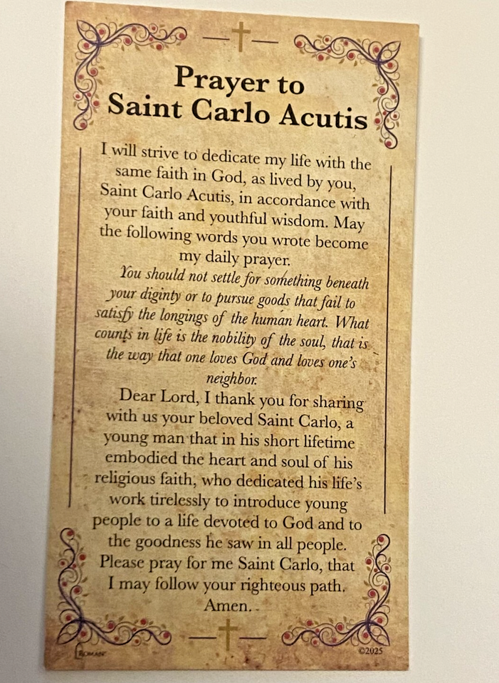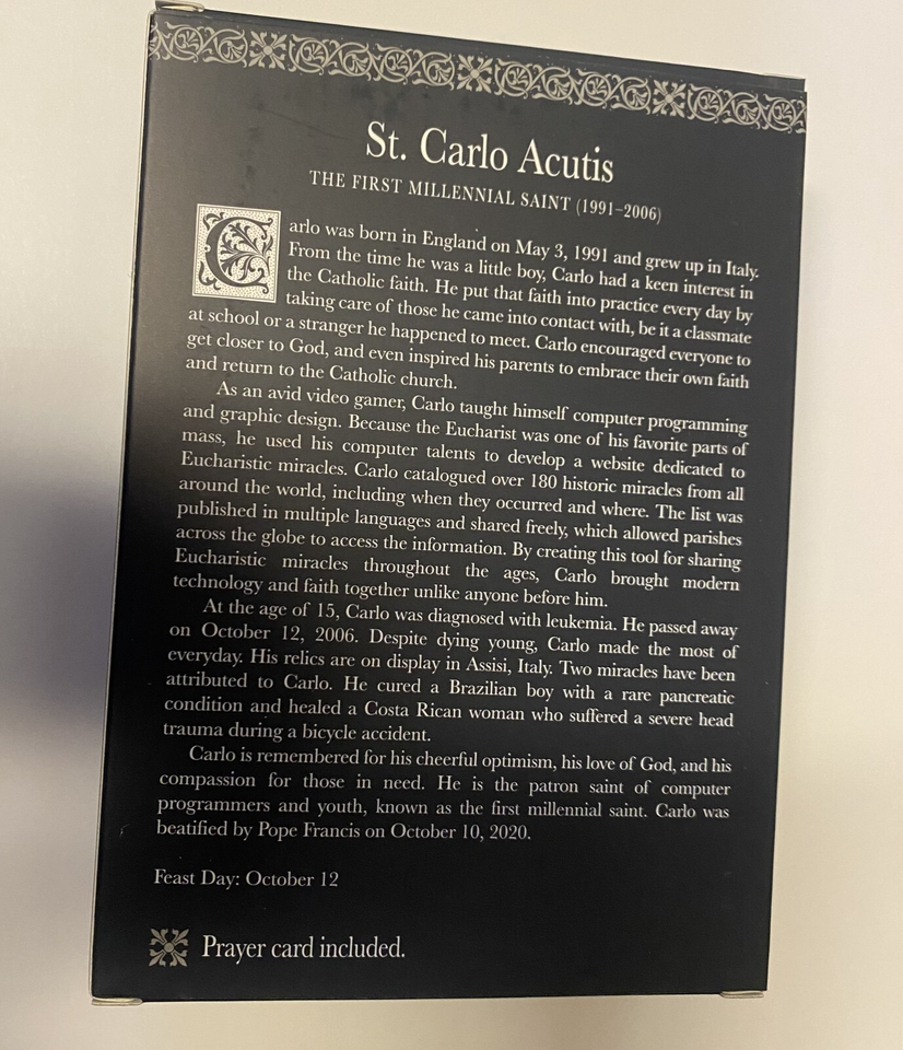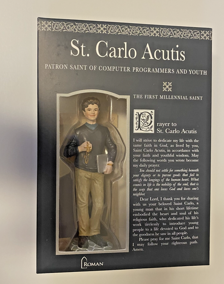 You are purchasing a very nice small 4" statue of Blessed Carlo Acutis. An English born Italian Catholic, Lover of the Eucharist. Also known at the patron of the internet. His deep devotion to the Eucharist, became the center of his life. He was beatified by Pope Francis on October 10, 2020. He created and designed an International Exhibition of the Eucharist.