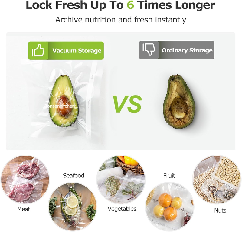?CUSTOMISED FOOD VACUUM BAGS? Bonsenkitchen vacuum sealer roll is compatible with all major brand vacuum sealers, you can make a customized-size vacuum bag in a few seconds.