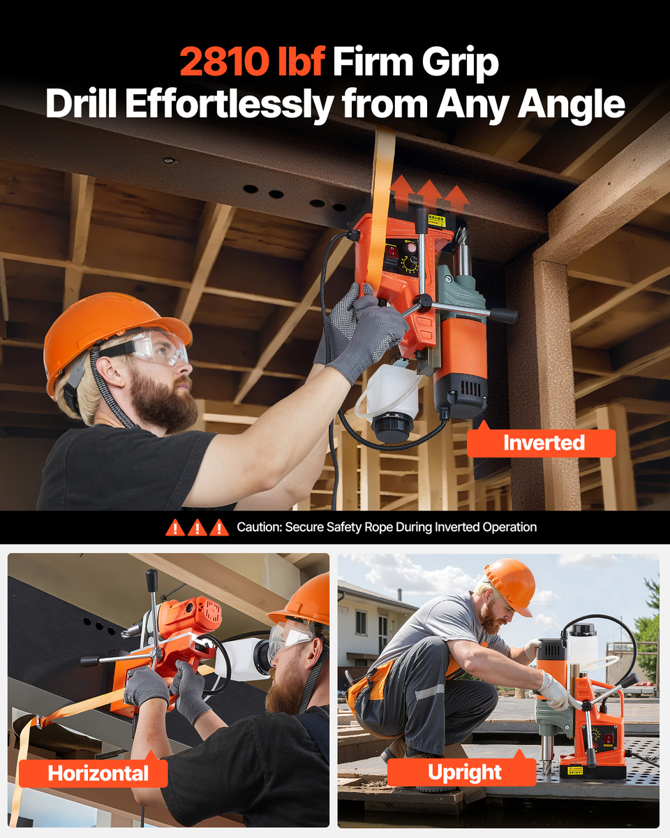 Strong Magnetic Force: The mag drill press is built with a thick, high-purity iron base for up to 2810 lbf / 12500 N magnetic force. It stays firmly in place even on vertical or sloped metal surfaces, ensuring stable and secure drilling