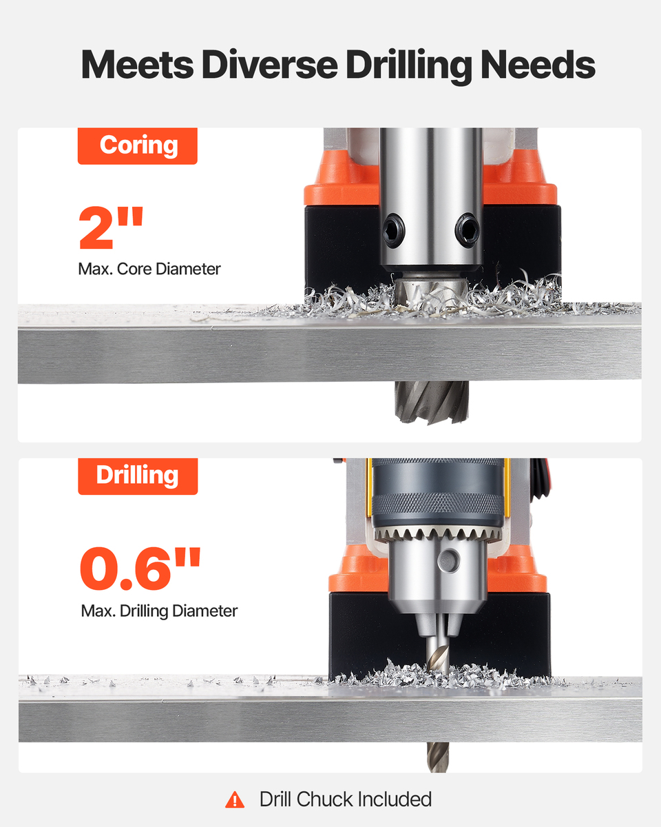 Powerful Drilling Performance: 1400W motor delivers efficient drilling. The magnetic drill press supports coring diameter up to 2" / 50 mm and twists drilling range from ?0.1"-0.6" / ?3-16 mm—ideal for both fine work and large-scale jobs