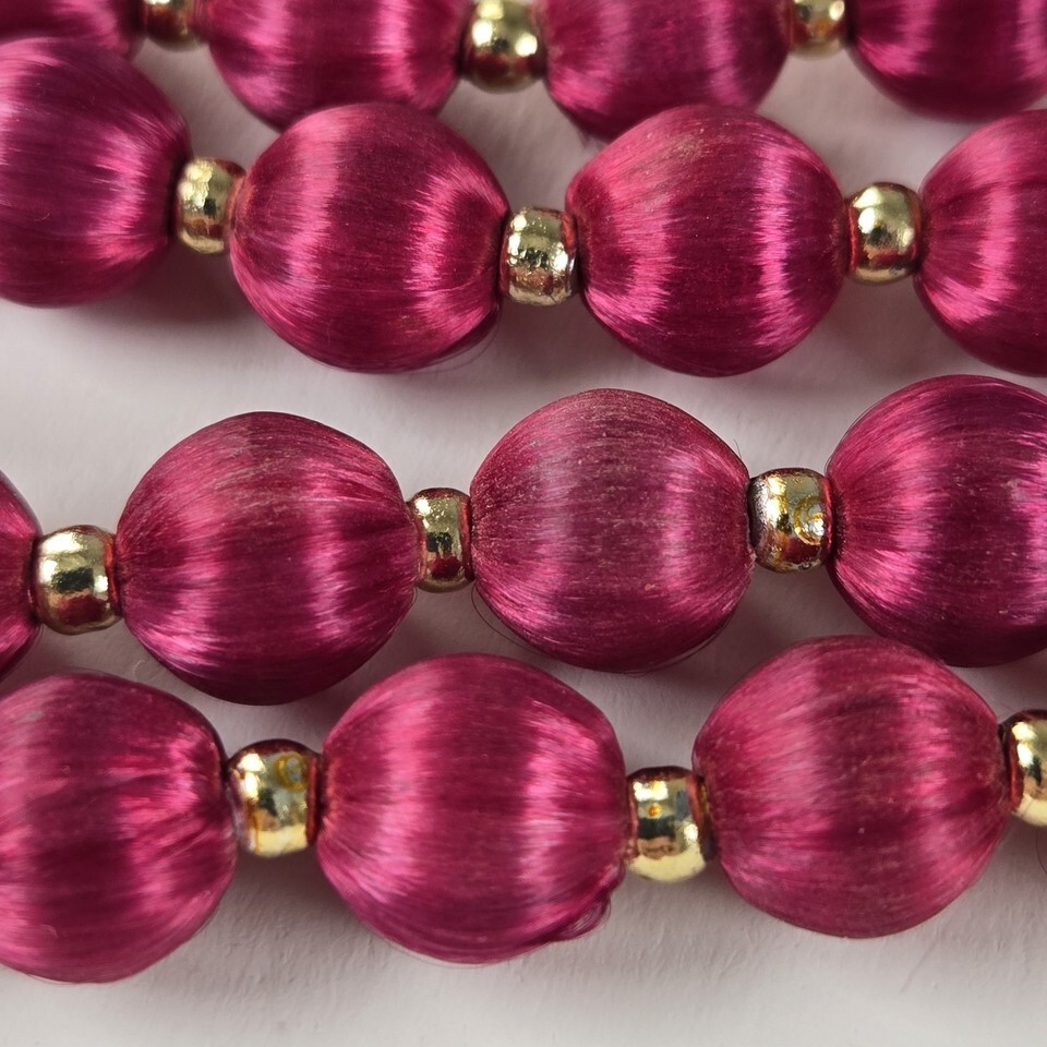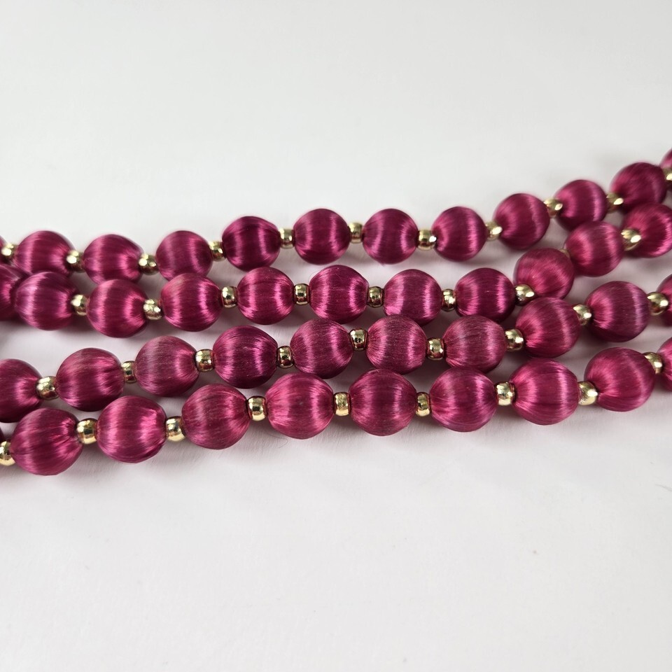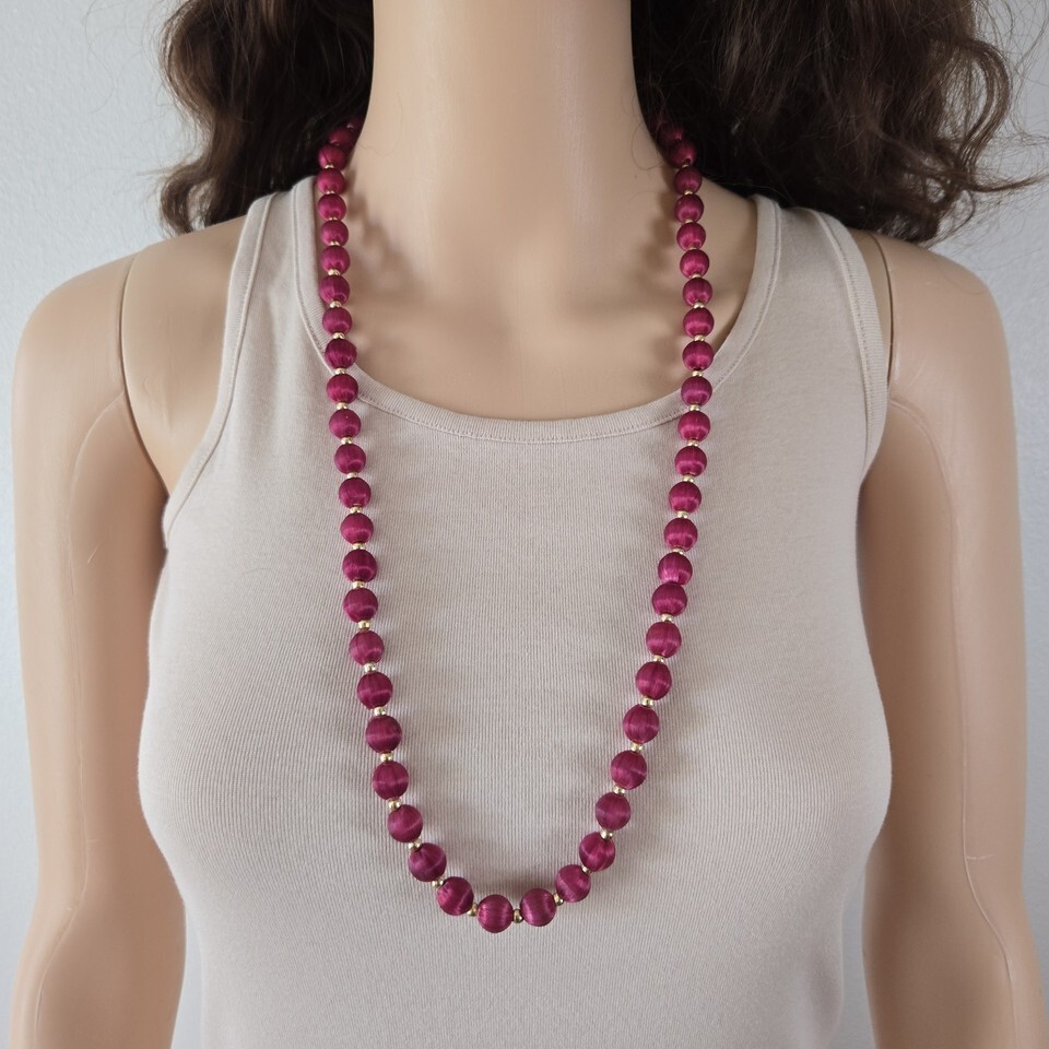 Vibrant long berry red silk wrapped beaded necklace. A unique, artisian style strand featuring silk covered beads offering a beautiful texture sheen. Perfect for layering or adding boho flair. The deep berry red hue is striking.