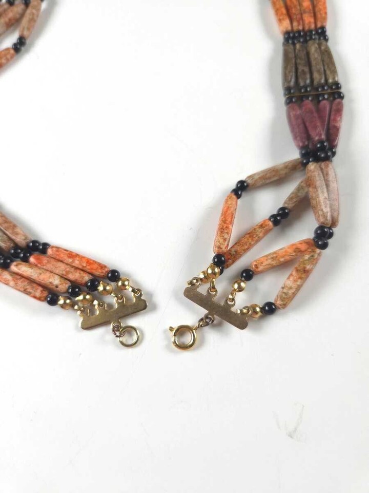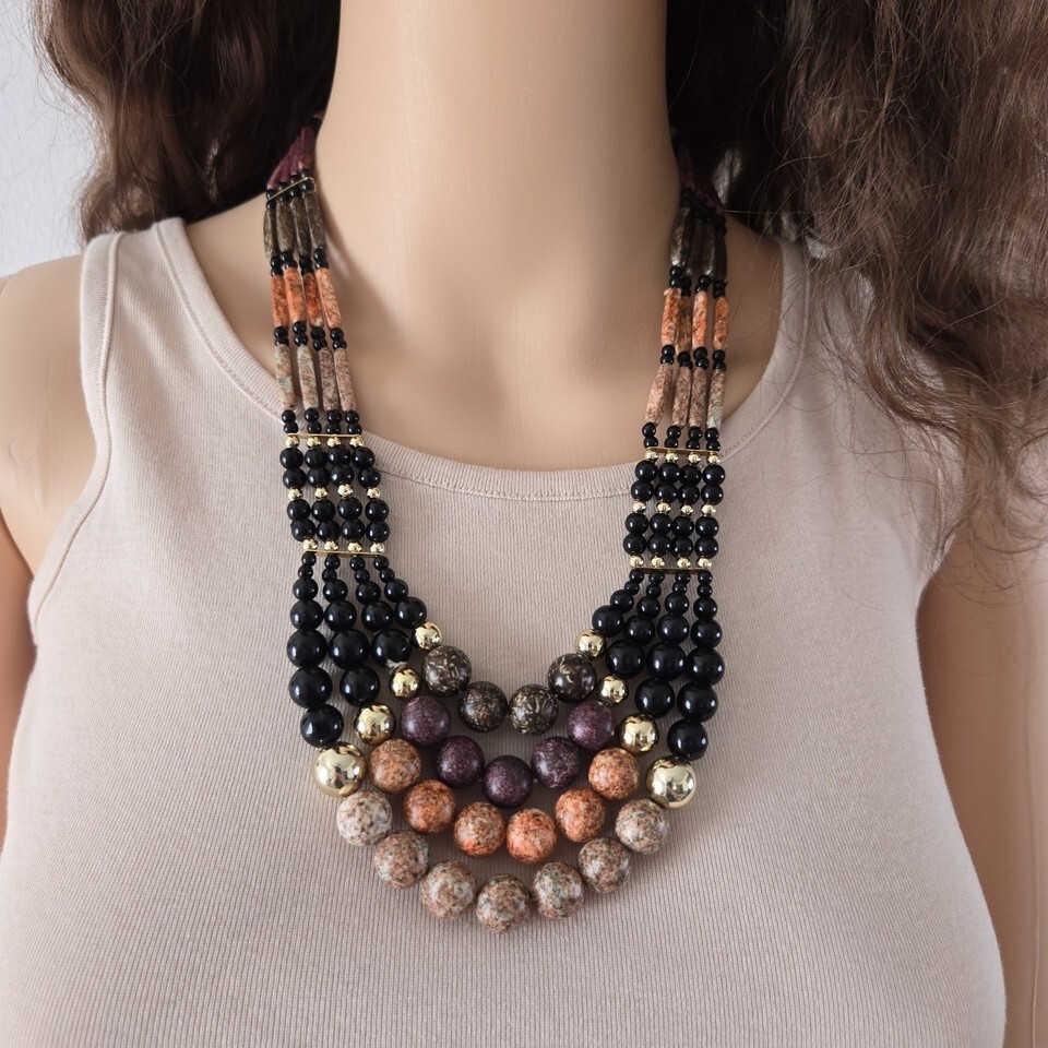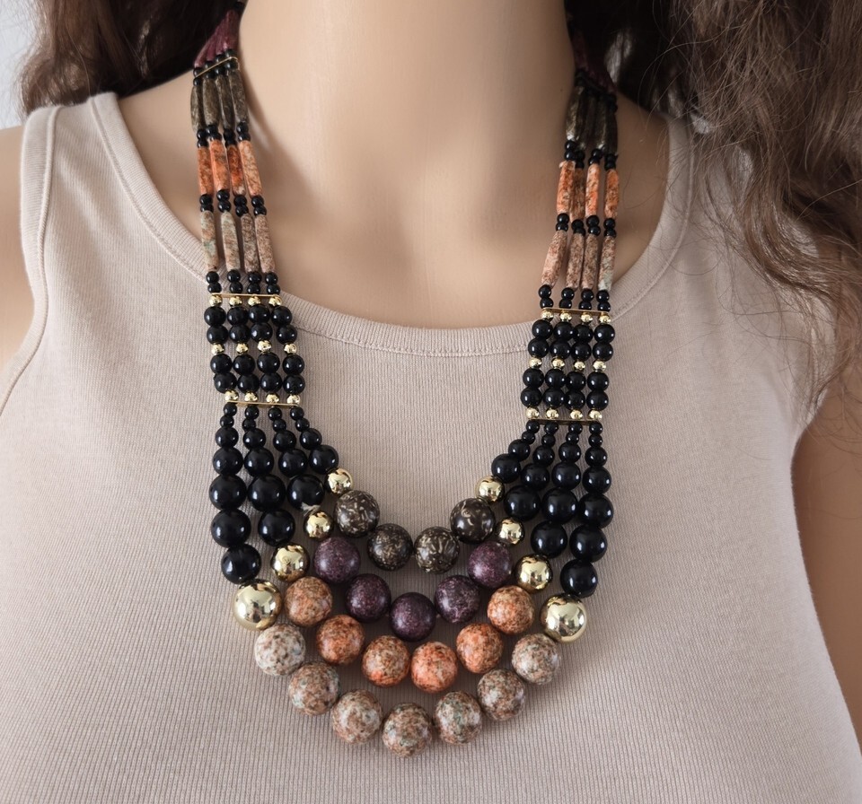 Black & Brown Wood Look Statement Necklace, Multi-Strand Vintage Bib