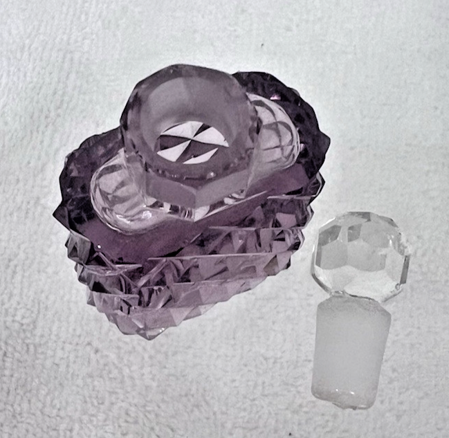 OLD Cut Crystal Purple Clear Scent Perfume Bottle Miniature 2" Diamond Cut In very good shape however a few super tiny fleabites here and there nothing large it took a magnifier to see