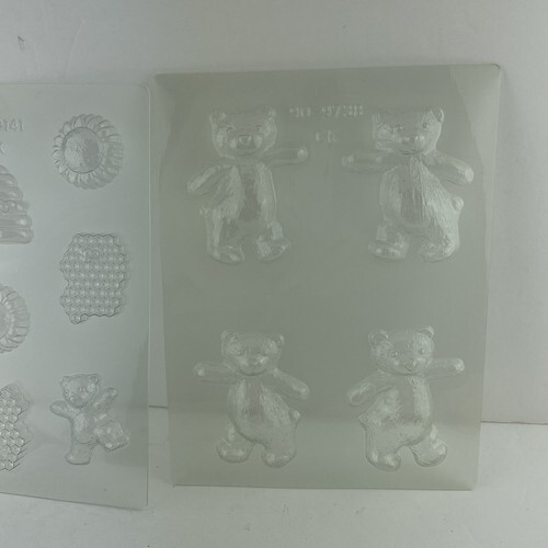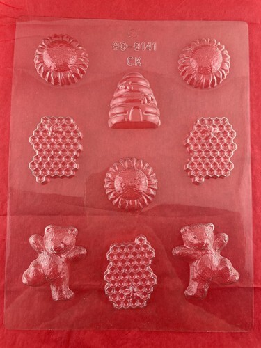 2 plastic soap molds in the shapes of bears, bear cubs, sunflowers, bee hives and honeycombs