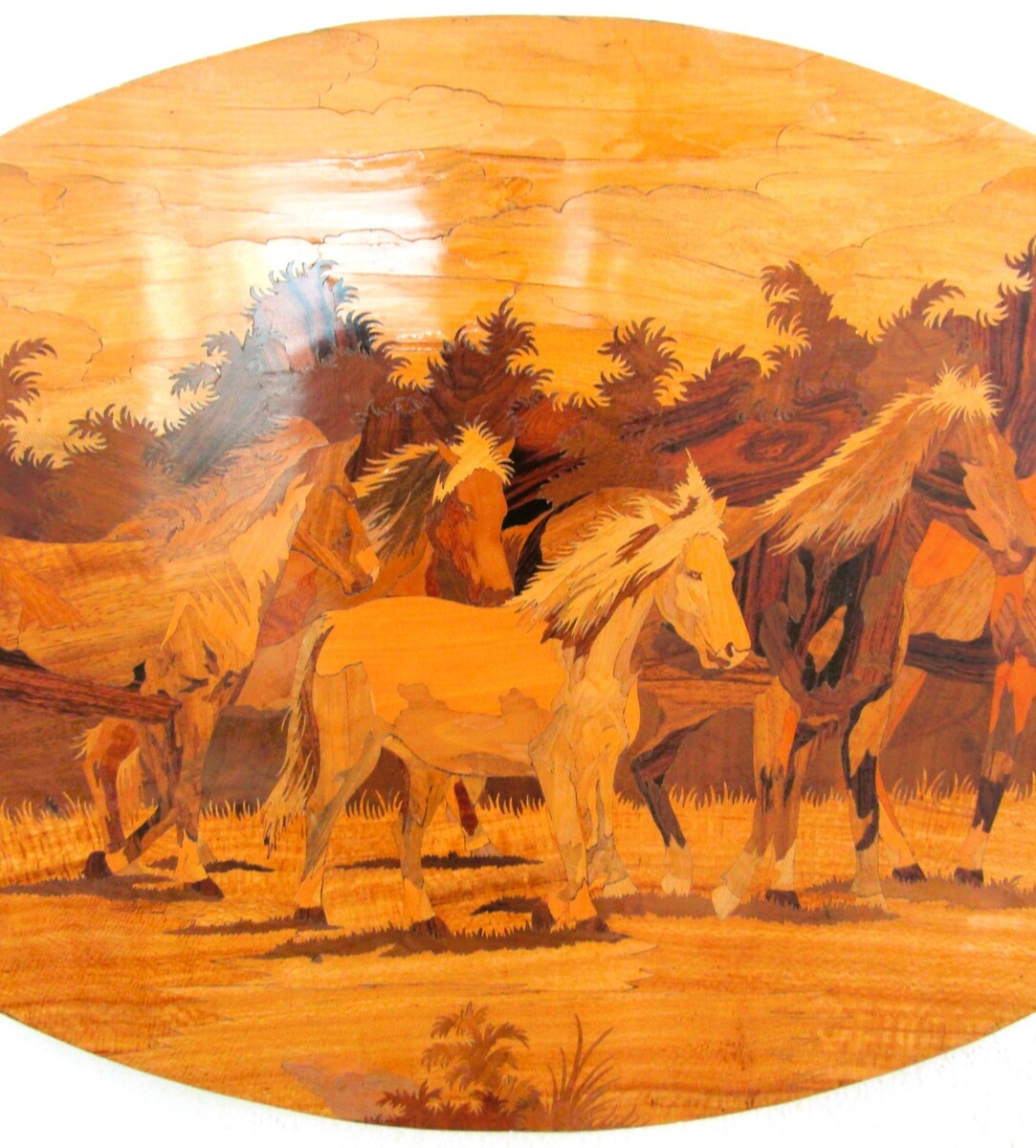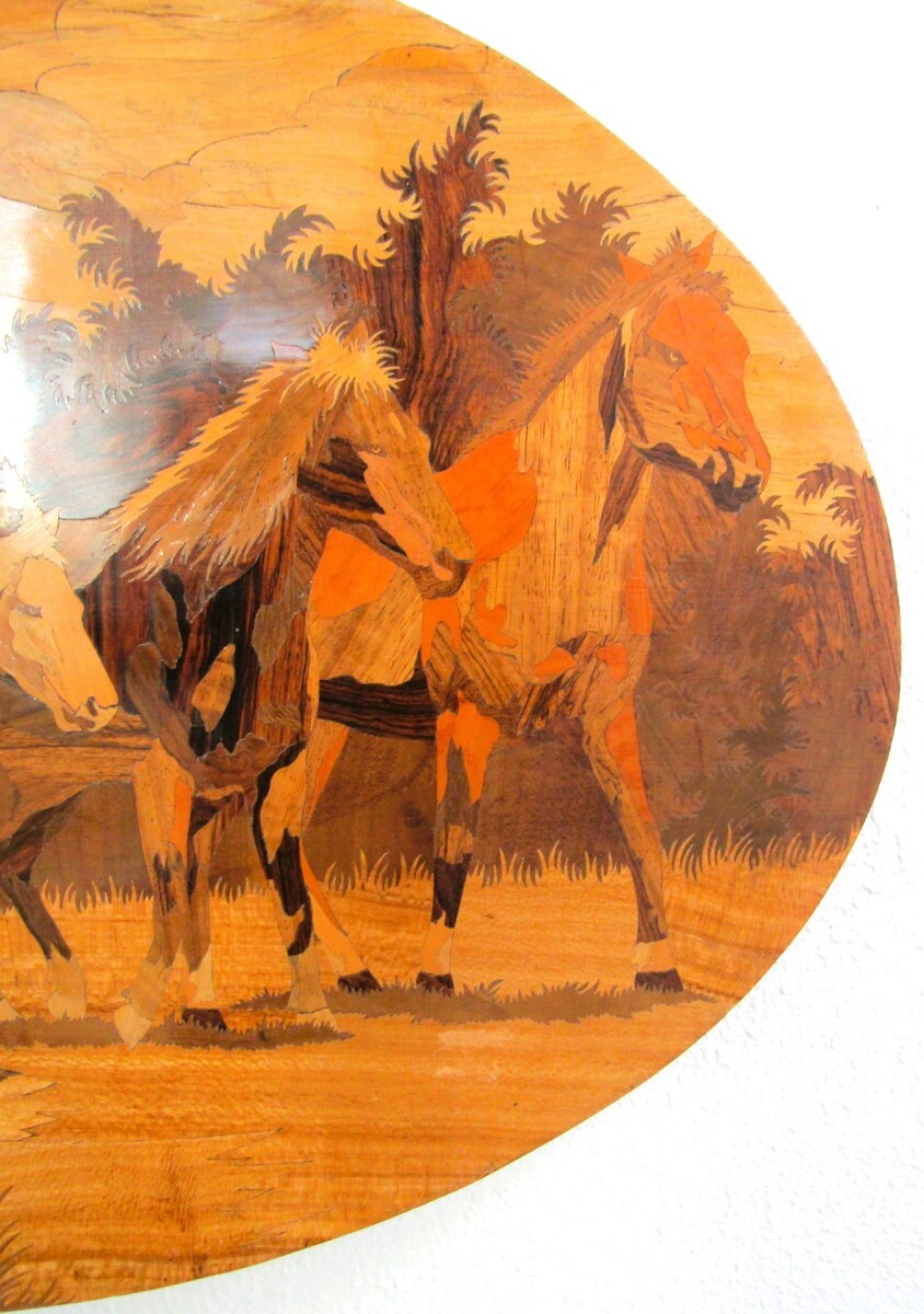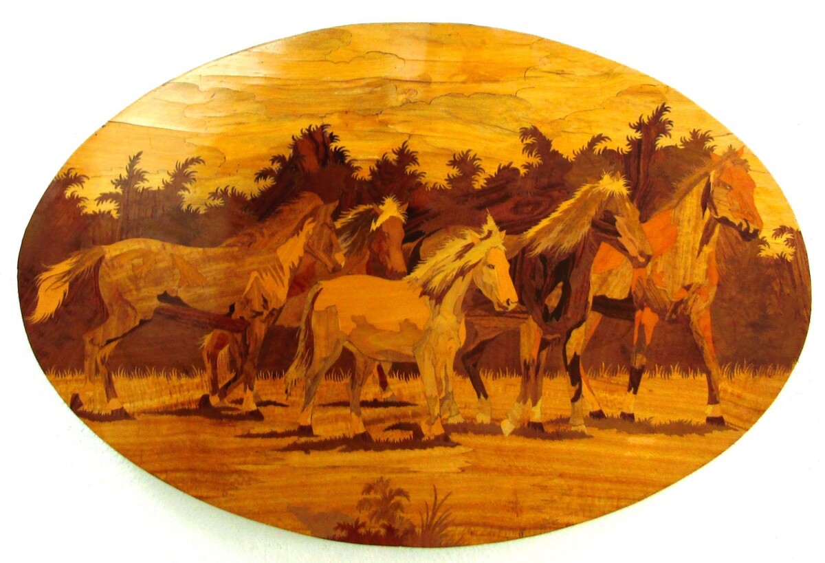 Vintage Horses Mustangs Inlay Wood Marquetry Large Oval Wall Art Panel